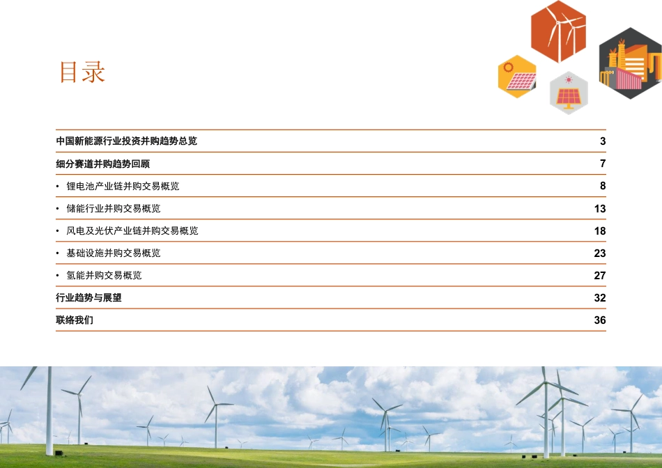 2023年中期中国新能源行业并购交易回顾及展望储电相倚,风光无限2023年8月目录中国新能源行业投资并购趋势总览3细分赛道并购趋势回顾7• 锂电池产业链并购交易概览8• 储能行业并购交易概览13• 风电及光伏产业链并购交易概览18• 基础设施并购交易概览23• 氢能并购交易概览27行业趋势与展望32联络我们36数据说明数据来源本报告中的数据除特殊注明外,均基于《汤森路透》、《Mergermarket》、《投中数据》、《清科》数据、公共新闻及普华永道分析提供的信息交易数量与金额• 本报告中提及的交易数量指对外公布的交易数量,无论其交易金额是否披露• 报告中提及的交易金额包含已公开披露金额的交易以及披露金额数量级约数取整的交易;由于部分交易未披露信息或者未披露交易金额,一定程度影响我们分析的全面性和趋势。如披露的交易金额为下述表中提及的约数,我们用相应的取整进行计算分析披露交易额度转换金额(人民币元)数十万500,000近百万/百万(级)1,000,000数百万5,000,000近千万/千万(级)10,000,000数千万50,000,000近亿/亿(级别)100,000,000数亿500,000,000除特别注明外,报告中所列示金额的计量单位均为人民币亿元。其中,对于用外币披露的交易,我们使用披露日当日中国银行公布的汇率中间价折算为人民币投资方向• 按照投资方向我们将交易分为国内交易、出境并购交易及入境并购交易,其中:− “国内交易”指投资方及被投资标的均位于中国大陆、香港或澳门特别行政区− “海外并购”指中国大陆、香港和澳门特别行政区企业在境外进行并购− “入境并购”指境外企业收购中国大陆、香港或澳门特别行政区企业新能源行业细分领域的说明• 包括锂电池、储能、风电及光伏产业链(含制造供应链及下游应用和服务)、基础设施(含清洁能源发电厂站、新能源汽车充电桩等)、氢能以及其他清洁能源(生物质能、垃圾焚烧、地热能、潮汐能等);请注意,以上分类标准主要基于普华永道对于行业在政策法规、交易特征,以及行业未来发展趋势上的理解而确定,不代表行业标准分类。2023年中期中国新能源行业并购市场回顾及展望2中国新能源行业投资并购趋势总览2023年中期中国新能源行业并购市场回顾及展望32023年上半年中国新能源行业投资并购趋势总览2023年中期中国新能源行业并购市场回顾及展望42023年1H中国新能源行业并购交易数据概览2023年上半年总交易金额1,371 亿人民币较2022年同期下降23%2023年上半年总交易数量395 笔较2022年...