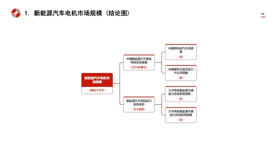 中国新能源汽车电机行业市场规模测算逻辑模型头豹词条报告系列发布日期:2023/08/08李子阳新能源汽车电机行业规模1. 新能源汽车电机市场规模 (结论图)P32. 新能源汽车电机市场规模P43. 中国纯电动汽车总销量P54. 中国插电式混合动力汽车总销量P65. 中国新能源汽车驱动电机总安装量P76. 大洋电机新能源车辆动力总成系统销售收入P87. 大洋电机新能源车辆动力总成系统销量P98. 新能源汽车电机动力系统单价P109. 溯源信息链接引用P1110. 溯源信息链接引用P1211. 法律声明P1312. 头豹研究院简介P1413. 头豹词条介绍P1514. 头豹词条报告P161. 新能源汽车电机市场规模 (结论图)P3新能源汽车电机市场规模:(结论=C*F)年份201820192020202120222023E2024E2025E2026E2027E数据(亿/人民币元)100.4440.5246.41138.82296.37456.46683.55965.251,254.831,631.28增长率(b-a)/a*100%--59.66%14.54%199.14%113.49%54.01%49.75%41.21%30%30% 新能源汽车电机市场规模:(结论=C*F)新能源汽车电机市场规模=新能源汽车电机市场总安装量*新能源汽车电机系统单价溯源链接1溯源链接2溯源链接3溯源链接4巨潮资讯因子说明溯源信息 中国新能源汽车驱动电机总安装量:C年份201820192020202120222023E2024E2025E2026E2027E数据(万/辆)122.78121.42130.5353.2709.391,092.571,636.132,310.393,003.513,904.57C1:增长率(b-a)/a*100%--1.11%7.48%170.65%100.85%54.01%49.75%41.21%30%30% 新能源汽车电机动力系统单价:F年份2017201820192020202120222023E2024E2025E2026E2027E数据(万/亿元)1.130.820.330.360.390.420.420.420.420.420.42F1:增长率(b-a)/a*100%--27.79%-59.21%6.57%10.53%6.3%0%0%0%0%0%2. 新能源汽车电机市场规模P4 SIZE总览中国纯电动汽车总销量:A年份201820192020202120222023E2024E2025E2026E2027E数据(万/辆)74.1880.5690.32244.18425.45553.08719934.711,215.121,579.65A1:增长率(b-a)/a*100%-8.6%12.12%170.35%74.24%30%30%30%30%30% 中国纯电动汽车总销量:A由乘联会中国BEV2022年6月-2023年5月月度销售数据,预测中国BEV总销量接下来的增长率为30%溯源链接1乘联会【深度分析】2022年12月份全国新能源市场深度分析报告因子说明溯源信息3. 中国纯电动汽车总销量P5 SIZE总览中国插电式混合动力汽车总销量:B年份201820192020202120222023E2024E2025E2026E2027E数据(万/辆)24.320.4320.0954.51141.97269.74458.56687.84894.21,162.4...