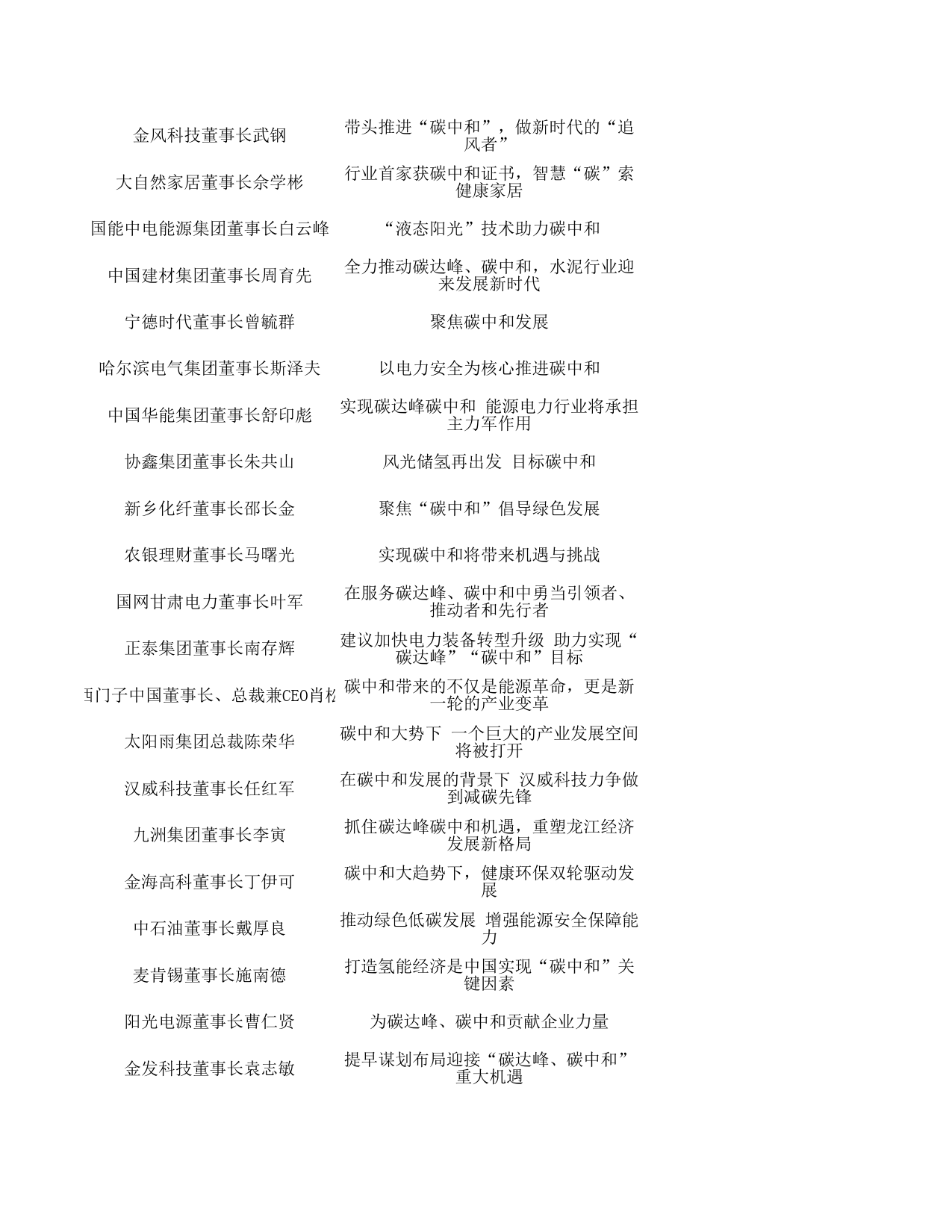 大佬名单标题北京绿交所董事长王乃祥碳量化、碳定价与碳金融是双碳利器中碳登董事长陈志祥北京燃气集团董事长李雅兰燃气在亚洲实现碳中和过程中的角色大唐集团有限公司董事长邹磊推进能耗总量和强度“双控”中美绿色基金董事长徐林金晶科技董事长王刚做“碳中和”的持续贡献者远大科技集团董事长张跃天合光能董事长高纪凡企业如何行动推动碳中和 中国银行董事长刘连舸东方希望董事长刘永行凯赛生物董事长刘修才兴证全球基金董事长杨华辉践行“碳中和”责任 打造绿色名片国投董事长白涛国有投资公司要争做碳中和的先行者 技术创新赋能“碳中和”之路毅达资本董事长应文禄碳中和基金必须突显专业化重要性振森电能有限公司董事长黄保江“碳中和”是机遇,也是挑战 马上消费董事长赵国庆打造绿色企业助力“碳中和”长鸿高科董事长陶春风54位上市公司大佬聊碳中和夯实全国碳市场之基,助力美丽中国建设我国绿色低碳转型发展 “良药”在于技术转型创新践行碳中和理念需从理念向高效行动转变未来40年实现碳中和目标投资将达百万亿元级别竭尽全力把“碳中和”这个伟大的事业做好生物制造是彻底解决碳中和的唯一途径联想集团董事长兼CEO杨元庆如何降低“碳约束”对企业生产活动的影响金风科技董事长武钢大自然家居董事长佘学彬国能中电能源集团董事长白云峰“液态阳光”技术助力碳中和中国建材集团董事长周育先宁德时代董事长曾毓群聚焦碳中和发展哈尔滨电气集团董事长斯泽夫以电力安全为核心推进碳中和中国华能集团董事长舒印彪协鑫集团董事长朱共山风光储氢再出发 目标碳中和新乡化纤董事长邵长金聚焦“碳中和”倡导绿色发展农银理财董事长马曙光实现碳中和将带来机遇与挑战国网甘肃电力董事长叶军正泰集团董事长南存辉太阳雨集团总裁陈荣华汉威科技董事长任红军九洲集团董事长李寅金海高科董事长丁伊可中石油董事长戴厚良麦肯锡董事长施南德阳光电源董事长曹仁贤为碳达峰、碳中和贡献企业力量金发科技董事长袁志敏带头推进“碳中和”,做新时代的“追风者”行业首家获碳中和证书,智慧“碳”索健康家居全力推动碳达峰、碳中和,水泥行业迎来发展新时代实现碳达峰碳中和 能源电力行业将承担主力军作用在服务碳达峰、碳中和中勇当引领者、推动者和先行者建议加快电力装备转型升级 助力实现“碳达峰”“碳中和”目标西门子中国董事长、总裁兼CEO肖松碳中和带来的不仅是能源革命,更是新一轮的产业变革碳中和大势下 一个巨大的产业发展空间将被打开...