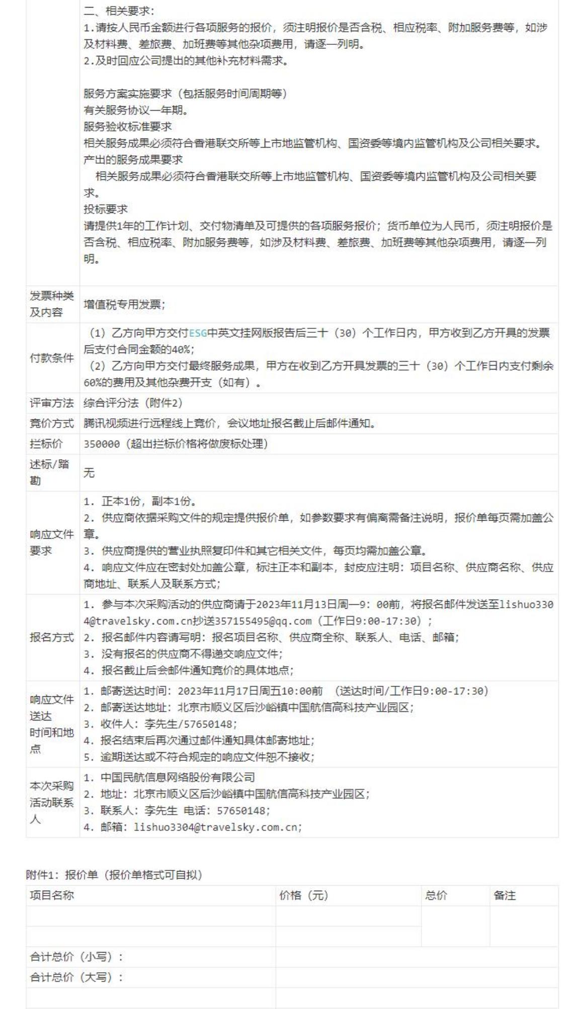 【招标】ESG咨询-中国航信可持续发展工作专业顾问项目采购公告