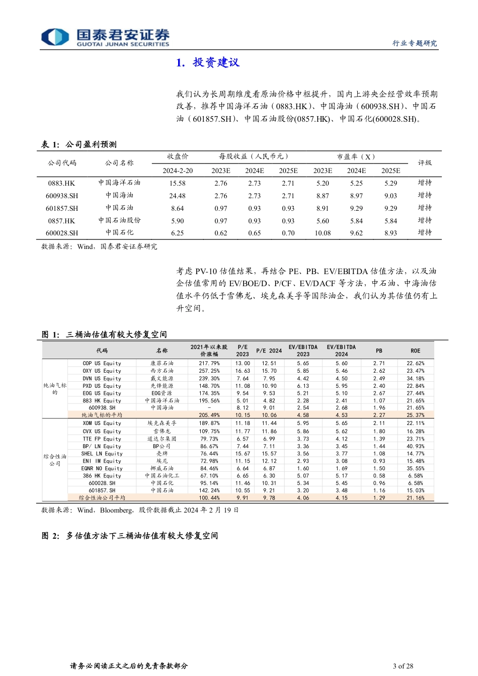请务必阅读正文之后的免责条款部分[Table_MainInfo][Table_Title]2024.02.21海内外油公司估值方法与红利策略探讨——石化央企专题研究孙羲昱(分析师)杨思远(分析师)陈浩越(研究助理)021-38677369021-38032022021-38031035sunxiyu@gtjas.comyangsiyuan026856@gtjas.comchenhaoyue028692@gtjas.com证书编号S0880517090003S0880522080005S0880123070130本报告导读:对标海外企业,国内上游央企估值仍有修复空间。近期海内外企业股价走势出现分化,市场预期国内企业经营效率改善。摘要:[Table_Summary]我们认为长周期维度看原油价格中枢提升,国内上游央企经营效率预期改善,推荐中国海洋石油(0883.HK)、中国海油(600938.SH)、中国石油(601857.SH)、中国石油股份(0857.HK)、中国石化(600028.SH)。从绝对估值和相对估值法看,对标海外企业国内上游央企估值仍有修复空间。油气产业链上游企业估值方法海外主要分为绝对估值法以及相对估值法。绝对估值法以PV-10为例,相对估值法海外企业常采用EV/EBITDA、EV/BOE/D、EV/2P、P/CF、EV/DACF等估值方法,通常上游企业还会考虑加回勘探费用做对比。从两种估值方法看,国内上游央企估值仍有上升可能性。长期看分红回购是提升企业估值的重要因素,十年维度看占样本企业总股东回报的50%以上。从近两年数据看,油气产业链样本企业总股东回报(分红回购及股价上涨)越低,分红回购贡献度越大。近五年数据来看,分红回购对提高总股东回报起到关键性作用。而十年维度的长周期看,分红+回购通常占到总股东回报的50%以上。海内外企业23年10月后股价走势出现分化,市场预期国内企业经营效率改善。海外公司股价与EPS变动相关性较强,PB估值与油价波动相关性较高。22年7月-23年3月海外企业PB估值强于油价。海外市场同样关注红利策略。复盘历史,滞胀背景下海外市场红利策略跑赢概率高。另一方面,国内上游央企10月以来股价表现相对更强;我们认为一方面在原油价格下跌时公司业绩抗波动性较强,另一方面隐含了市场对未来通过经营效率改善等提升ROE的预期。我们认为国企价值重估的理论基础在于市场关注分红比例和经营效率的改善,同时如果无风险利率下降,则企业WACC下降。风险提示:油价跌幅超预期,潜在储量开发不及预期,全球地缘冲突超预期[Table_Invest]评级:增持上次评级:增持[Table_subIndustry]细分行业评级[Table_DocReport]相关报告石油与天然气《市值或纳入考核,石化央企望迎价值重估》2024.01.25石油与天然气《海上油气工程服务行业景气度提升》2023.10.26石油与天然气《巴以冲突可能升级的风险加剧供应担忧》2023.10.15石油与天然气《原油价格高位震荡,关注中下游复苏节奏》2023.09.22石油与天然气《产油国挺价意愿强,原油进一步走强》2023.08.07行业专题研究股票研究证券研究报告[Table_industryInfo]石油与天然气行业专题研究请务必阅读正文之后的免责条款部分2of28目录1.投资建议.....................................................................................32.油气产业链不同环节所采用的估值方法的不同.............................42.1.上游油气公司的定义..............................................................43.2023年油价中枢回落,但央企经营效率改善,三桶油盈利保持较好水平...................................................................................................53.1.三桶油降本增效顺利,盈利能力得到进一步提升....................53.2.公司资产负债率低,财务状况良好.........................................63.3.中海油单桶盈利指标处于行业领先水平,石油石化盈利能力持续改善............................................................................................84.从绝对估值和相对估值看,三桶油相对国际同行估值有修复空间.94.1.PV-10估值表明中石油、中海油估值低于国际同行.................94.2.常用油气企业估值方法对比得出,海外上游公司估值低于中游,IOC估值高于NOC..............................................................