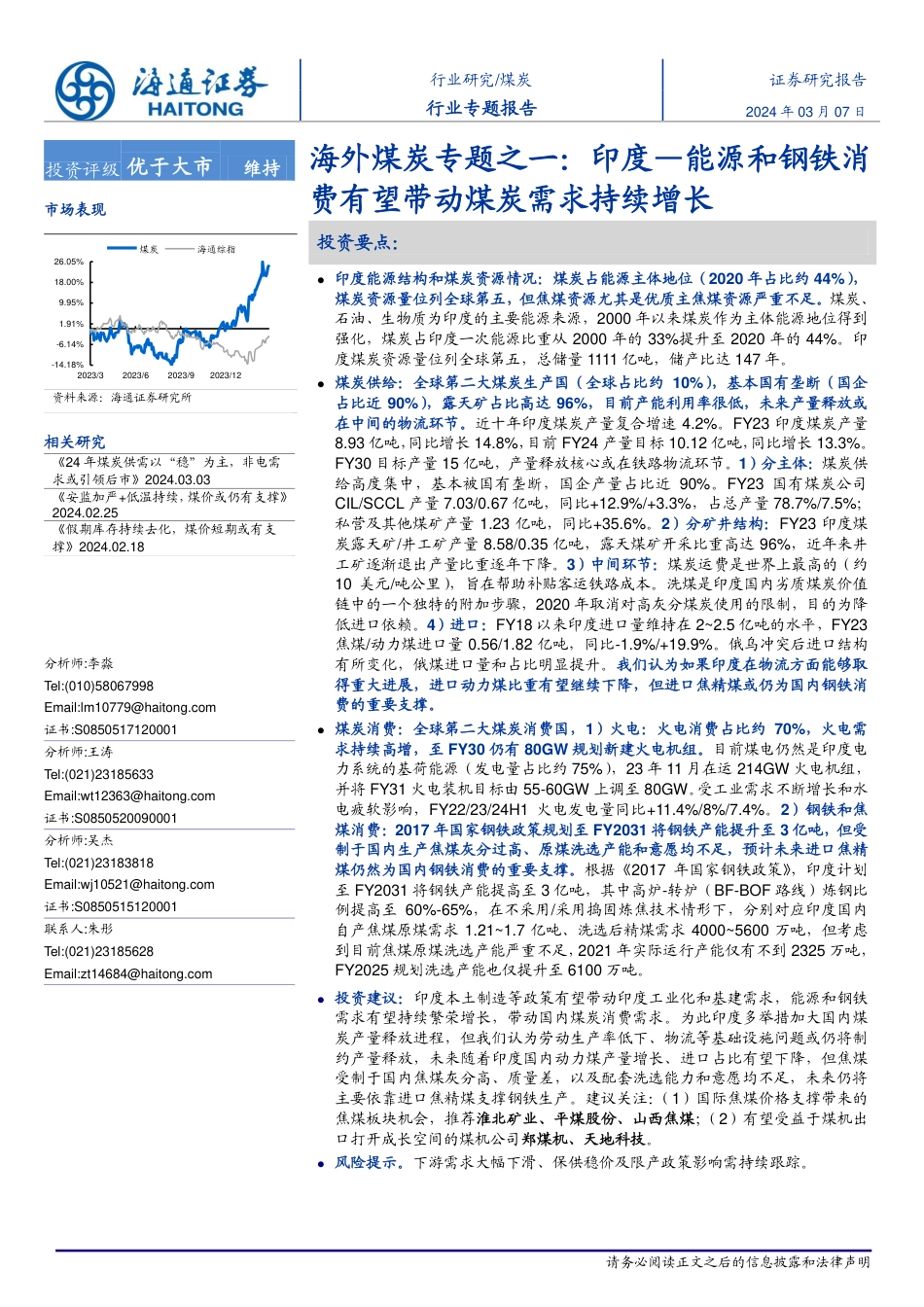 请务必阅读正文之后的信息披露和法律声明[Table_MainInfo]行业研究/煤炭证券研究报告行业专题报告2024年03月07日[Table_InvestInfo]投资评级优于大市维持市场表现[Table_QuoteInfo]-14.18%-6.14%1.91%9.95%18.00%26.05%2023/32023/62023/92023/12煤炭海通综指资料来源:海通证券研究所相关研究[Table_ReportInfo]《24年煤炭供需以“稳”为主,非电需求或引领后市》2024.03.03《安监加严+低温持续,煤价或仍有支撑》2024.02.25《假期库存持续去化,煤价短期或有支撑》2024.02.18[Table_AuthorInfo]分析师:李淼Tel:(010)58067998Email:lm10779@haitong.com证书:S0850517120001分析师:王涛Tel:(021)23185633Email:wt12363@haitong.com证书:S0850520090001分析师:吴杰Tel:(021)23183818Email:wj10521@haitong.com证书:S0850515120001联系人:朱彤Tel:(021)23185628Email:zt14684@haitong.com海外煤炭专题之一:印度—能源和钢铁消费有望带动煤炭需求持续增长[Table_Summary]投资要点:印度能源结构和煤炭资源情况:煤炭占能源主体地位(2020年占比约44%),煤炭资源量位列全球第五,但焦煤资源尤其是优质主焦煤资源严重不足。煤炭、石油、生物质为印度的主要能源来源,2000年以来煤炭作为主体能源地位得到强化,煤炭占印度一次能源比重从2000年的33%提升至2020年的44%。印度煤炭资源量位列全球第五,总储量1111亿吨,储产比达147年。煤炭供给:全球第二大煤炭生产国(全球占比约10%),基本国有垄断(国企占比近90%),露天矿占比高达96%,目前产能利用率很低,未来产量释放或在中间的物流环节。近十年印度煤炭产量复合增速4.2%。FY23印度煤炭产量8.93亿吨,同比增长14.8%,目前FY24产量目标10.12亿吨,同比增长13.3%。FY30目标产量15亿吨,产量释放核心或在铁路物流环节。1)分主体:煤炭供给高度集中,基本被国有垄断,国企产量占比近90%。FY23国有煤炭公司CIL/SCCL产量7.03/0.67亿吨,同比+12.9%/+3.3%,占总产量78.7%/7.5%;私营及其他煤矿产量1.23亿吨,同比+35.6%。2)分矿井结构:FY23印度煤炭露天矿/井工矿产量8.58/0.35亿吨,露天煤矿开采比重高达96%,近年来井工矿逐渐退出产量比重逐年下降。3)中间环节:煤炭运费是世界上最高的(约10美元/吨公里),旨在帮助补贴客运铁路成本。洗煤是印度国内劣质煤炭价值链中的一个独特的附加步骤,2020年取消对高灰分煤炭使用的限制,目的为降低进口依赖。4)进口:FY18以来印度进口量维持在2~2.5亿吨的水平,FY23焦煤/动力煤进口量0.56/1.82亿吨,同比-1.9%/+19.9%。俄乌冲突后进口结构有所变化,俄煤进口量和占比明显提升。我们认为如果印度在物流方面能够取得重大进展,进口动力煤比重有望继续下降,但进口焦精煤或仍为国内钢铁消费的重要支撑。煤炭消费:全球第二大煤炭消费国,1)火电:火电消费占比约70%,火电需求持续高增,至FY30仍有80GW规划新建火电机组。目前煤电仍然是印度电力系统的基荷能源(发电量占比约75%),23年11月在运214GW火电机组,并将FY31火电装机目标由55-60GW上调至80GW。受工业需求不断增长和水电疲软影响,FY22/23/24H1火电发电量同比+11.4%/8%/7.4%。2)钢铁和焦煤消费:2017年国家钢铁政策规划至FY2031将钢铁产能提升至3亿吨,但受制于国内生产焦煤灰分过高、原煤洗选产能和意愿均不足,预计未来进口焦精煤仍然为国内钢铁消费的重要支撑。根据《2017年国家钢铁政策》,印度计划至FY2031将钢铁产能提高至3亿吨,其中高炉-转炉(BF-BOF路线)炼钢比例提高至60%-65%,在不采用/采用捣固炼焦技术情形下,分别对应印度国内自产焦煤原煤需求1.21~1.7亿吨、洗选后精煤需求4000~5600万吨,但考虑到目前焦煤原煤洗选产能严重不足,2021年实际运行产能仅有不到2325万吨,FY2025规划洗选产能也仅提升至6100万吨。投资建议:印度本土制造等政策有望带动印度工业化和基建需求,能源和钢铁需求有望持续繁荣增长,带动国内煤炭消费需求。为此印度多举措加大国内煤炭产量释放进程,但我们认为劳动生产率低下、物流等基础设施问题或仍将制约产量释放,未来随着印度国内动力煤产量增长、进口占比有望下降,但焦煤受...