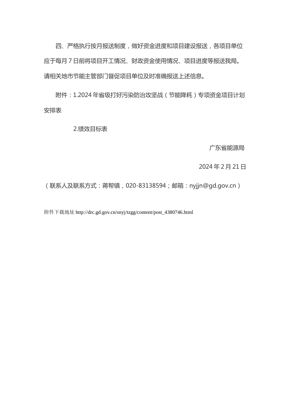 广东省能源局关于下达2024年省级打好污染防治攻坚战(节能降耗)专项资金项目计划的通知省有关单位,有关地级以上市发展改革局(委),惠州市能源和重点项目局:根据《广东省人民政府关于印发广东省省级财政专项资金管理办法(修订)的通知》(粤府〔2023〕34号)有关要求,现将2024年省级打好污染防治攻坚战(节能降耗)专项资金项目计划下达给你们,本计划下达资金额共计13500万元(附件1),具体执行拨付按照预算管理要求办理。有关事项通知如下:一、严格按照申报的项目名称、内容和规模进行建设,严禁滞留、挪作他用。严禁未经批准擅自变更建设内容、更改建设规模。如确需调整,须按程序报批。二、请有关地市节能主管部门协调相关单位尽快将资金拨付至项目单位,加快资金支出进度,同时加强对项目实施的日常监管,随时掌握资金支出进度和项目建设情况。三、项目单位要严格落实项目执行和监管主体责任,严格按照要求组织项目建设,加强绩效目标管理(附件2),确保如期保质保量完工,并积极配合项目验收、监督检查、审计和绩效评估等后续监管工作。四、严格执行按月报送制度,做好资金进度和项目建设报送,各项目单位应于每月7日前将项目开工情况、财政资金使用情况、项目进度等报送我局。请相关地市节能主管部门督促项目单位及时准确报送上述信息。附件:1.2024年省级打好污染防治攻坚战(节能降耗)专项资金项目计划安排表2.绩效目标表广东省能源局2024年2月21日(联系人及联系方式:蒋帮镇,020-83138594;邮箱:nyjjn@gd.gov.cn)附件下载地址http://drc.gd.gov.cn/snyj/tzgg/content/post_4380746.html