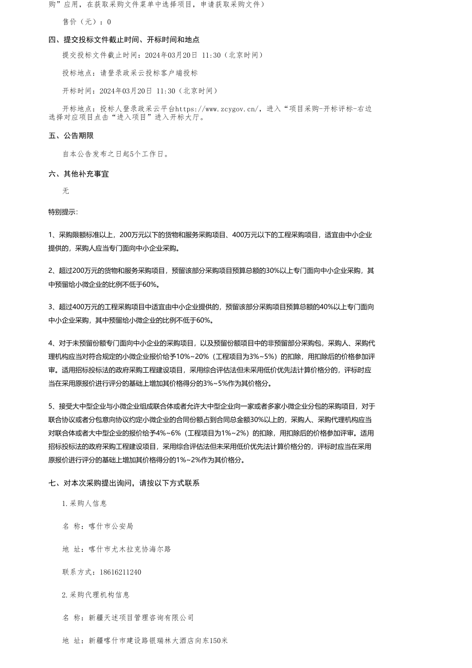 项目概况新能源车辆租赁服务采购项目招标项目的潜在投标人应在政采云平台线上获取招标文件,并于2024年03月20日11:30(北京时间)前递交投标文件。一、项目基本情况项目编号:XJTS-2024-GK-02项目名称:新能源车辆租赁服务采购项目采购方式:公开招标预算金额(元):8850000最高限价(元):8850000采购需求:标项名称:新能源车辆租赁服务采购项目数量:1预算金额(元):8850000简要规格描述或项目基本概况介绍、用途:为我局租赁新能源车辆150辆,租赁期三年备注:合同履约期限:标项1,三年,租赁服务金额一年一付本项目(否)接受联合体投标。二、申请人的资格要求:1.满足《中华人民共和国政府采购法》第二十二条规定;2.落实政府采购政策需满足的资格要求:标项1:专门面向小微企业3.本项目的特定资格要求:【标项1】具有相关主管部门颁发的有效的《汽车租赁经营备案证》或《道路交通运输经营许可证》,具有《道路运输经营许可证》的投标人其经营范围须包含汽车租赁或汽车租赁服务三、获取招标文件时间:2024年02月28日至2024年03月10日,每天上午00:00至12:00,下午12:00至23:59(北京时间,法定节假日除外)地点:政采云平台线上方式:供应商登录政采云平台https://www.zcygov.cn/在线申请获取采购文件(进入“项目采购”应用,在获取采购文件菜单中选择项目,申请获取采购文件)售价(元):0四、提交投标文件截止时间、开标时间和地点提交投标文件截止时间:2024年03月20日11:30(北京时间)投标地点:请登录政采云投标客户端投标开标时间:2024年03月20日11:30(北京时间)开标地点:投标人登录政采云平台https://www.zcygov.cn/,进入“项目采购-开标评标-右边选择对应项目点击“进入项目”进入开标大厅。五、公告期限自本公告发布之日起5个工作日。六、其他补充事宜无特别提示:1、采购限额标准以上,200万元以下的货物和服务采购项目、400万元以下的工程采购项目,适宜由中小企业提供的,采购人应当专门面向中小企业采购。2、超过200万元的货物和服务采购项目,预留该部分采购项目预算总额的30%以上专门面向中小企业采购,其中预留给小微企业的比例不低于60%。3、超过400万元的工程采购项目中适宜由中小企业提供的,预留该部分采购项目预算总额的40%以上专门面向中小企业采购,其中预留给小微企业的比例不低于60%。4、对于未预留份额专门面向中小企业的采购项目,以及预留份额项目中的非预留部分采购包,采购人、采购代理机构应当对符合规定的小微企业报价给予10%~20%(工程项目为3%~5%)的扣除,用扣除后的价格参加评审。适用招标投标法的政府采购工程建设项目,采用综合评估法但未采用低价优先法计算价格分的,评标时应当在采用原报价进行评分的基础上增加其价格得分的3%~5%作为其价格分。5、接受大中型企业与小微企业组成联合体或者允许大中型企业向一家或者多家小微企业分包的采购项目,对于联合协议或者分包意向协议约定小微企业的合同份额占到合同总金额30%以上的,采购人、采购代理机构应当对联合体或者大中型企业的报价给予4%~6%(工程项目为1%~2%)的扣除,用扣除后的价格参加评审。适用招标投标法的政府采购工程建设项目,采用综合评估法但未采用低价优先法计算价格分的,评标时应当在采用原报价进行评分的基础上增加其价格得分的1%~2%作为其价格分。七、对本次采购提出询问,请按以下方式联系1.采购人信息名称:喀什市公安局地址:喀什市尤木拉克协海尔路联系方式:186162112402.采购代理机构信息名称:新疆天述项目管理咨询有限公司地址:新疆喀什市建设路银瑞林大酒店向东150米联系方式:181995429993.项目联系方式项目联系人:崔雪娇电话:18199542999
