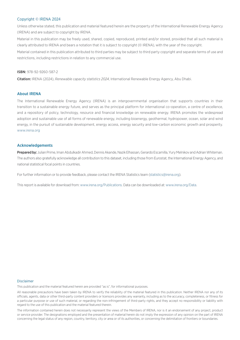 www.irena.orgRENEWABLECAPACITYSTATISTICS2024STATISTIQUESDECAPACITÉRENOUVELABLE2024ESTADÍSTICASDECAPACIDADRENOVABLE2024Copyright©IRENA2024Unlessotherwisestated,thispublicationandmaterialfeaturedhereinarethepropertyoftheInternationalRenewableEnergyAgency(IRENA)andaresubjecttocopyrightbyIRENA.Materialinthispublicationmaybefreelyused,shared,copied,reproduced,printedand/orstored,providedthatallsuchmaterialisclearlyattributedtoIRENAandbearsanotationthatitissubjecttocopyright(©IRENA),withtheyearofthecopyright.Materialcontainedinthispublicationattributedtothirdpartiesmaybesubjecttothirdpartycopyrightandseparatetermsofuseandrestrictions,includingrestrictionsinrelationtoanycommercialuse.ISBN:978-92-9260-587-2Citation:IRENA(2024),Renewablecapacitystatistics2024,InternationalRenewableEnergyAgency,AbuDhabi.AboutIRENATheInternationalRenewableEnergyAgency(IRENA)isanintergovernmentalorganisationthatsupportscountriesintheirtransitiontoasustainableenergyfuture,andservesastheprincipalplatformforinternationalco-operation,acentreofexcellence,andarepositoryofpolicy,technology,resourceandfinancialknowledgeonrenewableenergy.IRENApromotesthewidespreadadoptionandsustainableuseofallformsofrenewableenergy,includingbioenergy,geothermal,hydropower,ocean,solarandwindenergy,inthepursuitofsustainabledevelopment,energyaccess,energysecurityandlow-carboneconomicgrowthandprosperity.www.irena.orgAcknowledgementsPreparedby:JulianPrime,ImanAbdulkadirAhmed,DennisAkande,NazikElhassan,GerardoEscamilla,YuryMelnikovandAdrianWhiteman.Theauthorsalsogratefullyacknowledgeallcontributiontothisdataset,includingthosefromEurostat,theInternationalEnergyAgency,andnationalstatisticalfocalpointsincountries.Forfurtherinformationortoprovidefeedback,pleasecontacttheIRENAStatisticsteam(statistics@irena.org).Thisreportisavailablefordownloadfrom:www.irena.org/Publications.Datacanbedownloadedat:www.irena.org/Data.DisclaimerThispublicationandthematerialfeaturedhereinareprovided“asis”,forinformationalpurposes.AllreasonableprecautionshavebeentakenbyIRENAtoverifythereliabilityofthematerialfeaturedinthispublication.NeitherIRENAnoranyofitsofficials,agents,dataorotherthird-partycontentprovidersorlicensorsprovidesanywarranty,includingastotheaccuracy,completeness,orfitnessforaparticularpurposeoruseofsuchmaterial,orregardingthenon-infringementofthird-partyrights,andtheyacceptnoresponsibilityorliabilitywithregardtotheuseofthispublicationandthematerialfeaturedtherein.TheinformationcontainedhereindoesnotnecessarilyrepresenttheviewsoftheMembersofIRENA,norisitanendorsementofanyproject,productorserviceprovider.ThedesignationsemployedandthepresentationofmaterialhereindonotimplytheexpressionofanyopiniononthepartofIRENAconcerningthelegalstatusofanyregion,country,territory,cityorareaorofitsauthorities,orconcerningthedelimitationoffrontiersorboundaries.FOREWORDHighlightingthecontinuedprogressachievedintheglobalenergytransition,thislatesteditionofIRENA’sRenewablecapacitystatisticsillustratesthegrowthofrenewablesinnewinstalledpowergenerationcapacityin2023.Bytheendof2023,renewablesaccountedfor43%ofglobalinstalledpowercapacity.Yet,aswedrawclosertoaworldinwhichrenewableenergyaccountsforhalfoftotalcapacity,manyenergyplanningquestionsstillneedtobeaddressedtoestablishrenewablesasthemostsignificantsourceofelectricitygeneration-includinginthecontextofgridf...