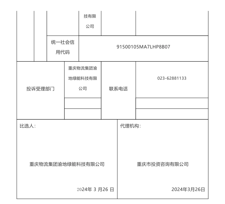 【中标】碳资产-重庆物流集团渝地绿能科技有限公司充电桩温室气体减排量开发服务项目拟中选结果公示表-重庆碳管家科技有限公司_第1页