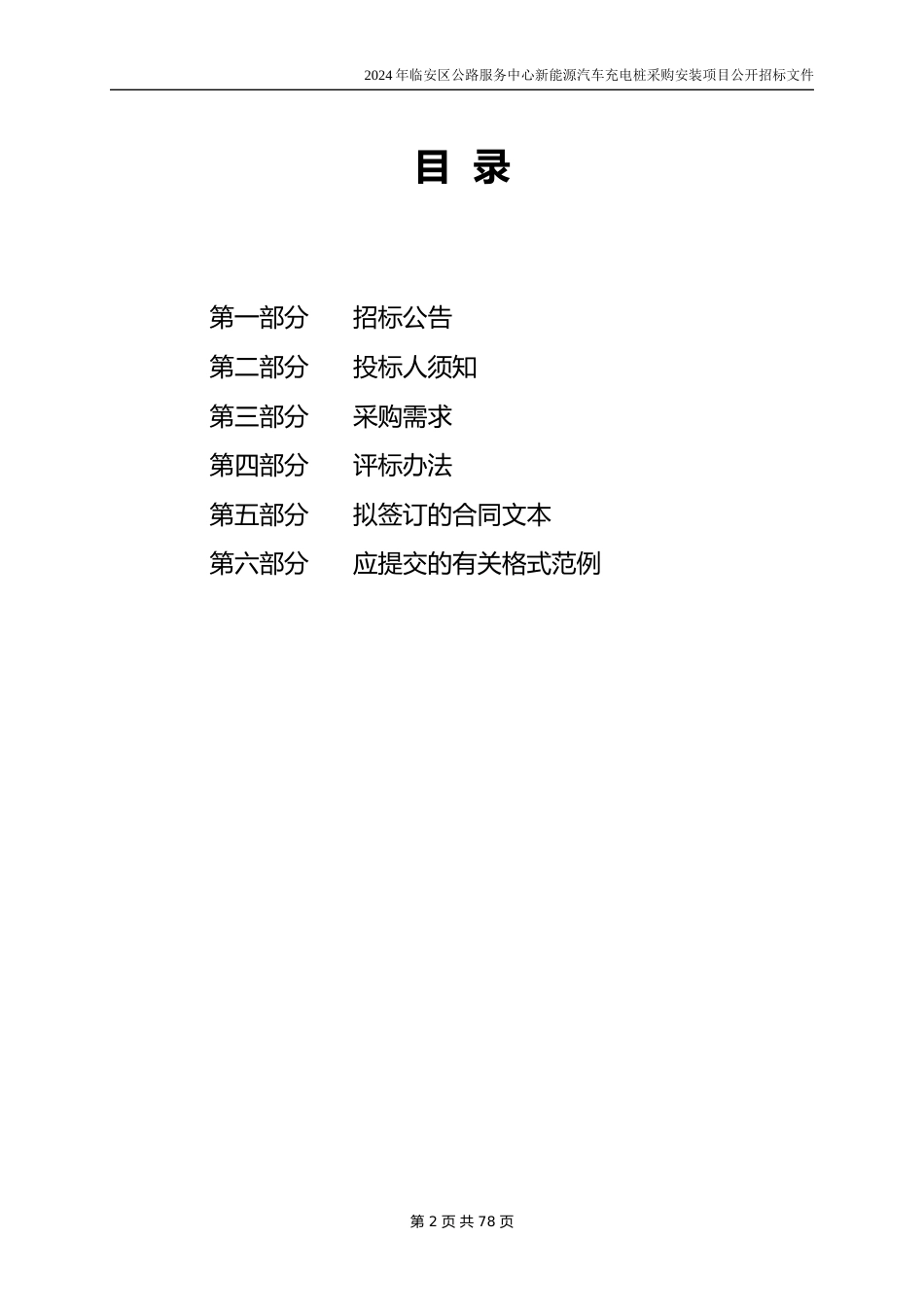 2024年临安区公路服务中心新能源汽车充电桩采购安装项目公开招标文件2024年临安区公路服务中心新能源汽车充电桩采购安装项目招标文件(电子招投标)编号:[2024]511号采购人:杭州市临安区公路服务中心采购代理机构:浙江建友工程咨询有限公司二〇二四年四月第1页共78页2024年临安区公路服务中心新能源汽车充电桩采购安装项目公开招标文件目录第一部分招标公告第二部分投标人须知第三部分采购需求第四部分评标办法第五部分拟签订的合同文本第六部分应提交的有关格式范例第2页共78页2024年临安区公路服务中心新能源汽车充电桩采购安装项目公开招标文件第一部分招标公告项目概况2024年临安区公路服务中心新能源汽车充电桩采购安装项目招标项目的潜在投标人应在政采云平台(https://www.zcygov.cn/)获取(下载)招标文件,并于2024年4月23日14点00分00秒(北京时间)前递交(上传)投标文件。一、项目基本情况项目编号:[2024]511号项目名称:2024年临安区公路服务中心新能源汽车充电桩采购安装项目预算金额(元):547000最高限价(元):543597采购需求:为推进我省电动汽车充电基础设施发展,规范充电基础设施投资建设、运营,根据国务院办公厅《关于进一步构建高质量充电基础设施体系的指导意见》,根据省交通运输厅的任务要求,做好国省道、县道等公路沿线充电设施建设的工作。具体以招标文件第三部分采购需求为准,供应商可点击本公告下方“浏览采购文件”查看采购需求。合同履约期限:30日历天(含提供方案及完成施工)本项目接受联合体投标:是;否。二、申请人的资格要求:1.满足《中华人民共和国政府采购法》第二十二条规定;未被“信用中国”(www.creditchina.gov.cn)、中国政府采购网(www.ccgp.gov.cn)列入失信被执行人、重大税收违法案件当事人名单、政府采购严重违法失信行为记录名单;2.以联合体形式投标的,提供联合协议(本项目不接受联合体投标或者投标人不以联合体形式投标的,则不需要提供);3.落实政府采购政策需满足的资格要求:无(注:不得限制大中型企业与小微企业组成联合体参与投标);专门面向中小企业货物全部由符合政策要求的中小微企业制造,提供中小企业声明函;要求以联合体形式参加,提供联合协议和中小企业声明函,联合协议中中小企业合同金额应当达到%,其中小微企业合同金额应当达到%;如果供应商本身提供所第3页共78页3332024年临安区公路服务中心新能源汽车充电桩采购安装项目公开招标文件有标的均由中小企业制造、承建或承接,并相应达到了前述比例要求,视同符合了资格条件,无需再与其他中小企业组成联合体参加政府采购活动,无需提供联合协议;要求合同分包,提供分包意向协议和中小企业声明函,分包意向协议中中小企业合同金额应当达到达到%,其中小微企业合同金额应当达到%;如果供应商本身提供所有标的均由中小企业制造、承建或承接,并相应达到了前述比例要求,视同符合了资格条件,无需再向中小企业分包,无需提供分包意向协议;4.本项目的特定资格要求:无;5.单位负责人为同一人或者存在直接控股、管理关系的不同供应商,不得参加同一合同项下的政府采购活动;为采购项目提供整体设计、规范编制或者项目管理、监理、检测等服务后不得再参加该采购项目的其他采购活动。三、获取招标文件时间:/至2024年4月23日,每天上午00:00至12:00,下午12:00至23:59(北京时间,线上获取法定节假日均可,线下获取文件法定节假日除外)地点(网址):政采云平台(https://www.zcygov.cn/)方式:供应商登录政采云平台https://www.zcygov.cn/在线申请获取采购文件(进入“项目采购”应用,在获取采购文件菜单中选择项目,申请获取采购文件)。售价(元):0四、提交投标文件截止时间、开标时间和地点提交投标文件截止时间:2024年4月23日14点00分00秒(北京时间)投标地点(网址):政采云平台(https://www.zcygov.cn/)开标时间:2024年4月23日14点00分00秒开标地点(网址):政采云平台(https://www.zcygov.cn/)五、公告期限自本公告发布之日起5个工作日。六...