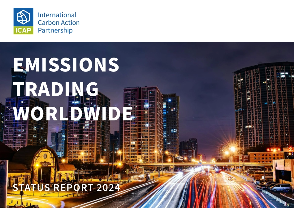 ICAPStatusReport2024STATUSREPORT2024EMISSIONSTRADINGWORLDWIDE1ICAPStatusReport2024EmissionsEMISSIONSTRADINGWORLDWIDEINTERNATIONALCARBONACTIONPARTNERSHIPSTATUSREPORT2024CITEAS:ICAP(2024).EmissionsTradingWorldwide:StatusReport2024.Berlin:InternationalCarbonActionPartnership.EDITORIALTEAM:KatjaBiedenkopf,ZhibinChen,StefanoDeClara,BaranDoda,AlexanderEden,MaiaHall,LeonHeckmann,IrynaHolovko,DavidHynes,MartinaKehrer,StephanieLaHozTheuer,TrevorLaroche-Theune,AndresOlartePena,VictorOrtizRivera,SantiagoRamirezNiembro,AnastasiaSteinlein,LewisStevens,TheresaWildgrube.TheICAPSecretariatexpressesitsgratitudetopolicymakersfromtheICAPmembershipandfurthercollaboratorsfromtheemissionstradingfield,whoprovidedinsightfulwrittencontributionsand/orcarefullyreviewedthereport:AlbertaMinistryofEnvironmentandProtectedAreas,AgustinaCundari(Argentina),KateHancock(Australia),IngridKropman(Australia),PatrickPassey(Australia),RobinDamberger(Austria),MichaelGrabner(Austria),FabianStöckl(Austria),FengjvYu(Beijing),PauloCoelhoAvila(Brazil),BeatrizSoares(Brazil),CaitlinCopage(BritishColumbia),AmandaEngel(BritishColumbia),BrianMurata(BritishColumbia),RachelGold(California),HaleyHamza(California),RajinderSahota(California),MarkSippola(California),CamilleSultana(California),ErinSzelagowski(California),EnvironmentandClimateChangeCanada,JuanPedroSearleSolar(Chile),SinoCarbon(ChinaandChinesePilots),MarcoAntonioMurciaBaquero(Colombia),ClayClarke(Colorado),AlekKahn(Colorado),GregoryMarcinkowski(Colorado),MeganMcCarthy(Colorado),MatthewTwyman(Colorado),CeciliaWhite(Colorado),DamienMeadows(EuropeanCommission),MatthieuMoulonguet(EuropeanCommission),DimitarNikov(EuropeanCommission),FrancoisSchmitt(EuropeanCommission),JuliaZiemann(EuropeanCommission),DominikMüller(Germany),DirkWeinreich(Germany),XuelanZeng(Guangdong),SaurabhDiddi(India),AtikSheikh(India),SachiVohra(India),AnandiniMayang(Indonesia),MinistryoftheEnvironmentofJapan,BotagozAkhmetova(Kazakhstan),AimiraBazarbayeva(Kazakhstan),MuhamadRidzwanBinAli(Malaysia),ChrisHoagland(Maryland),WilliamSpace(Massachusetts/RGGI),SurielIslasMartínez(Mexico),NenoJablan(Montenegro),YevgenYesyrkenov(Montenegro),NewBrunswickDepartmentofEnvironmentandLocalGovernment,JonathanBinder(NewYorkState),LoisNew(NewYorkState),OnaPapageorgiou(NewYorkState),KaraPaulsen(NewYorkState),NathamPutnam(NewYorkState),CaitlinStephen(NewYorkState),2ICAPStatusReport2024EmissionsCharlotteBerg(NewZealand),DanielBoczniewicz(NewZealand),AmeeraClayton(NewZealand),ScottGulliver(NewZealand),ArwenNorrish(NewZealand),GeraldCrane(NewfoundlandandLabrador),JenniferForristall-Prim(NewfoundlandandLabrador),WilliamBrooke(NovaScotia),MichelleMiller(NovaScotia),OntarioMinistryoftheEnvironment,ConservationandParks,RachelFernandez(Oregon),ColinMcConnaha(Oregon),NicoleSingh(Oregon),HadikaJamshaid(Pakistan),PennsylvaniaDepartmentofEnvironmentalProtection,RommelReyes(Philippines),JonathanBeaulieu(Québec),JulieCôté(Québec),SteveDoucet-Héon(Québec),NicolasGarceau(Québec),OlivierLacroix(Québec),AndréNormandin(Québec),JulieParadis(Québec),KimRicard(Québec),MouradZiani(Québec),MaureenLee(Ecoeye,RepublicofKorea),BrianWoods(RGGI),AdamGorr(Saskatchewan),LindsayJackiw(Saskatchewan),AlyssaKimber(Saskatchewan),DongxingFan(Shanghai),SimonFellermeyer(Switzerland),ThomasKellerhals(Switzerland),RongphetBunchuaidee(Thailand...