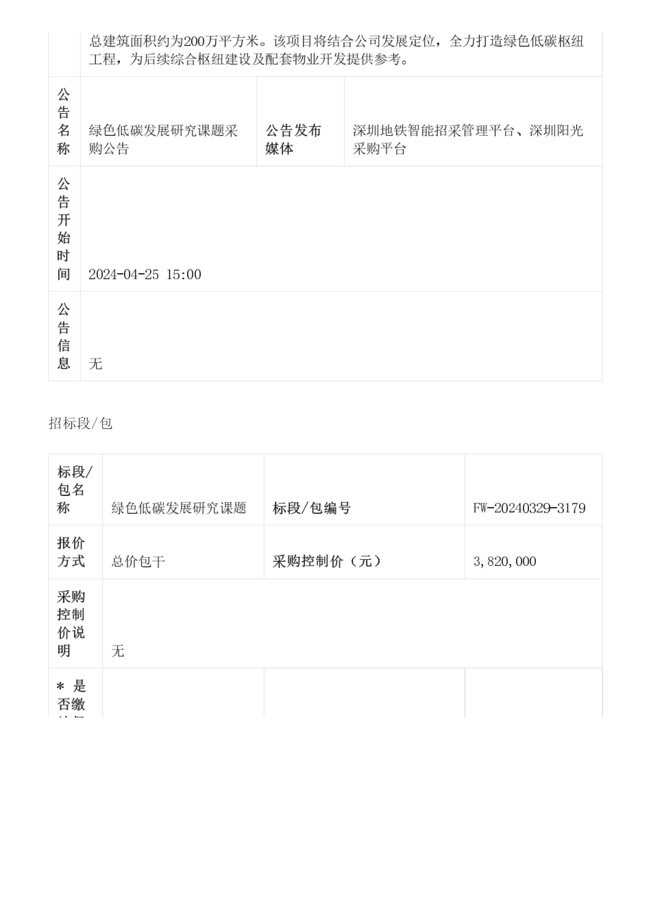 【招标】碳课题382万-深圳地铁置业集团有限公司绿色低碳发展研究课题采购公告_第1页
