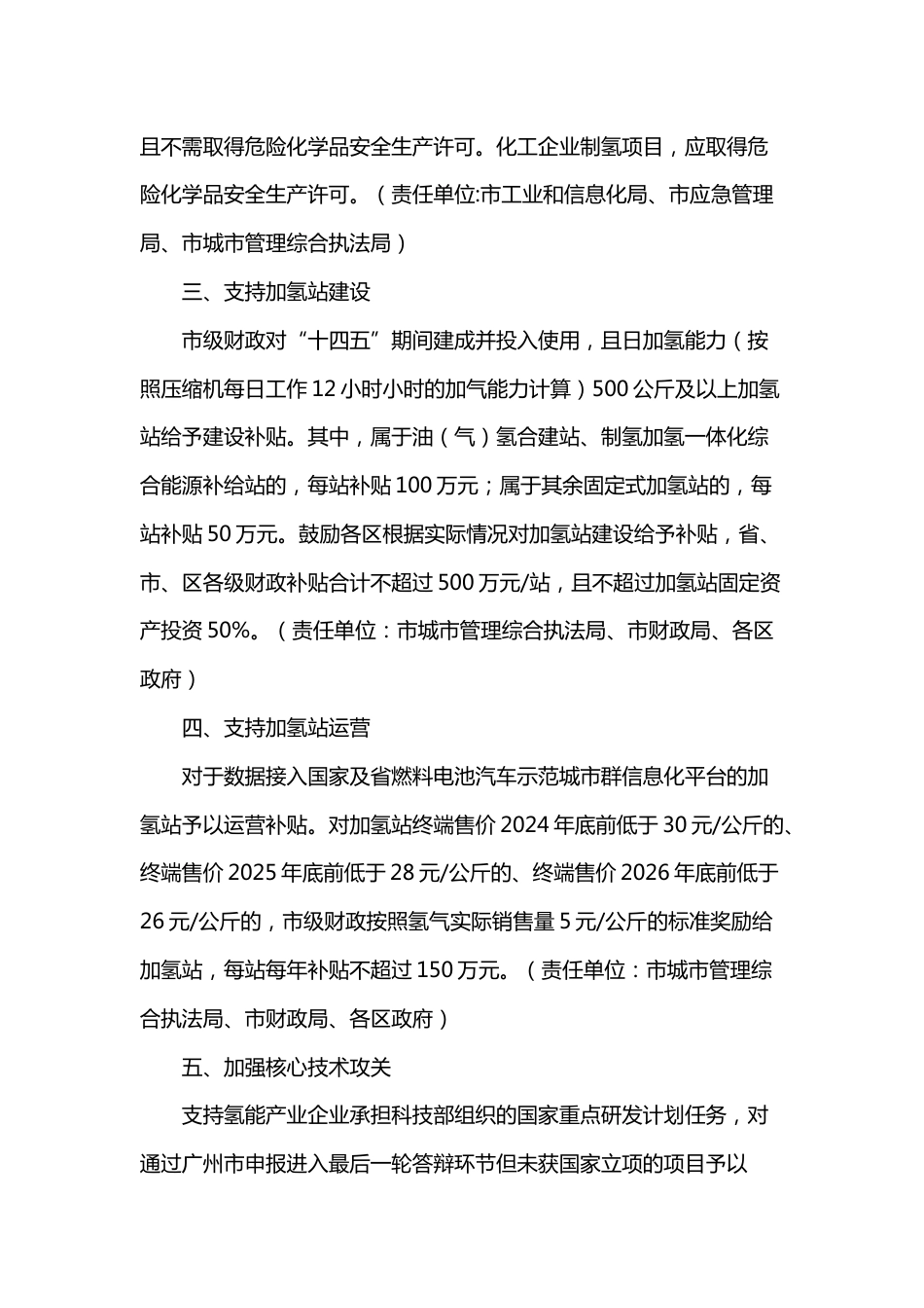 关于加快推动氢能产业高质量发展的若干措施(征求意见稿)为深入贯彻落实国家“碳达峰、碳中和”发展战略,积极构建我市氢能产业体系,支持氢能产业持续健康发展,根据《氢能产业发展中长期规划(2021-2035年)》《广东省加快氢能产业创新发展的意见》等政策,结合我市实际,制定以下支持政策。一、加大财政资金支持统筹中央、省和市级财政资金,市级财政根据上级政策要求和全市氢能产业发展需要,按照每年一定规模安排氢能产业发展资金,用于支持本市加氢站建设、氢能供应、氢燃料电池关键零部件研发及产业化、氢燃料电池汽车推广应用及氢能多元化示范应用等方面。(责任部门:市财政局、市发展和改革委、市工业和信息化局、市城市管理综合执法局)二、提升氢气供应能力鼓励氢能企业积极探索集中采购、带量采购及与氢气供应企业建立战略合作关系等形式,有效降低氢气采购成本。(市发展和改革委、市工业和信息化局、各区政府)加快推进全市氢气规模化生产项目建设,积极引导制氢企业以有竞争力的氢气资源参与全市氢能产业高质量发展。允许在化工园区外建设电解水、生物质气化与裂解、天然气重整等制氢项目,发电厂利用低谷时段富余发电能力电解水制氢项目和富余蒸汽热解制氢项目,且不需取得危险化学品安全生产许可。化工企业制氢项目,应取得危险化学品安全生产许可。(责任单位:市工业和信息化局、市应急管理局、市城市管理综合执法局)三、支持加氢站建设市级财政对“十四五”期间建成并投入使用,且日加氢能力(按照压缩机每日工作12小时小时的加气能力计算)500公斤及以上加氢站给予建设补贴。其中,属于油(气)氢合建站、制氢加氢一体化综合能源补给站的,每站补贴100万元;属于其余固定式加氢站的,每站补贴50万元。鼓励各区根据实际情况对加氢站建设给予补贴,省、市、区各级财政补贴合计不超过500万元/站,且不超过加氢站固定资产投资50%。(责任单位:市城市管理综合执法局、市财政局、各区政府)四、支持加氢站运营对于数据接入国家及省燃料电池汽车示范城市群信息化平台的加氢站予以运营补贴。对加氢站终端售价2024年底前低于30元/公斤的、终端售价2025年底前低于28元/公斤的、终端售价2026年底前低于26元/公斤的,市级财政按照氢气实际销售量5元/公斤的标准奖励给加氢站,每站每年补贴不超过150万元。(责任单位:市城市管理综合执法局、市财政局、各区政府)五、加强核心技术攻关支持氢能产业企业承担科技部组织的国家重点研发计划任务,对通过广州市申报进入最后一轮答辩环节但未获国家立项的项目予以“递补支持”,每个项目定额支持100万元。支持氢能产业“链主”企业、龙头企业和领军企业聚焦产业发展痛点,链接科研院所、高等院校和各类科技企业,牵头组建体系化、任务型的创新联合体,联动行业上下游产学研用力量开展跨领域协作,攻克关键技术。(责任单位:市科技局)六、推动关键零部件产业化对为广州获得国家燃料电池汽车示范城市群考核“关键零部件研发产业化”积分的企业给予市级财政资金奖励,参照国家综合评定奖励积分,原则上每1积分奖励5万元,每个企业同类产品获得中央、省级、市级奖励总额不超过5000万元。(责任单位:市发展和改革委、市财政局)七、推动规模化应用对满足国家综合评定奖励积分要求的前1万辆车辆(2021年8月13日后在广东城市群内登记上牌的车辆,2021年8月13日前登记上牌的车辆按此前国家和省相关要求执行),数据已接入国家及省燃料电池汽车示范城市群信息化平台,且不少于5项关键零部件在示范城市群内制造,按照燃料电池系统额定功率补贴3000元/千瓦(单车补贴最大功率不超过110千瓦,最小功率不低于50千瓦)。中央、省、市级奖励资金按照1:1:1比例安排。对完成全省推广目标后的补贴标准另行制定。(责任单位:市发展和改革委、市财政局)八、支持产业集群发展鼓励氢燃料电池系统生产企业或整车企业牵头组建创新联合体,开展燃料电池国产关键零部件工程化验证应用。对通过项目评审的创新联合体,每个补助资金2000万元,并支持创新联合体产品在本市推广应用。(责任单位:市发展和改革委、市财政局)九、支持制造业项目落地对氢...