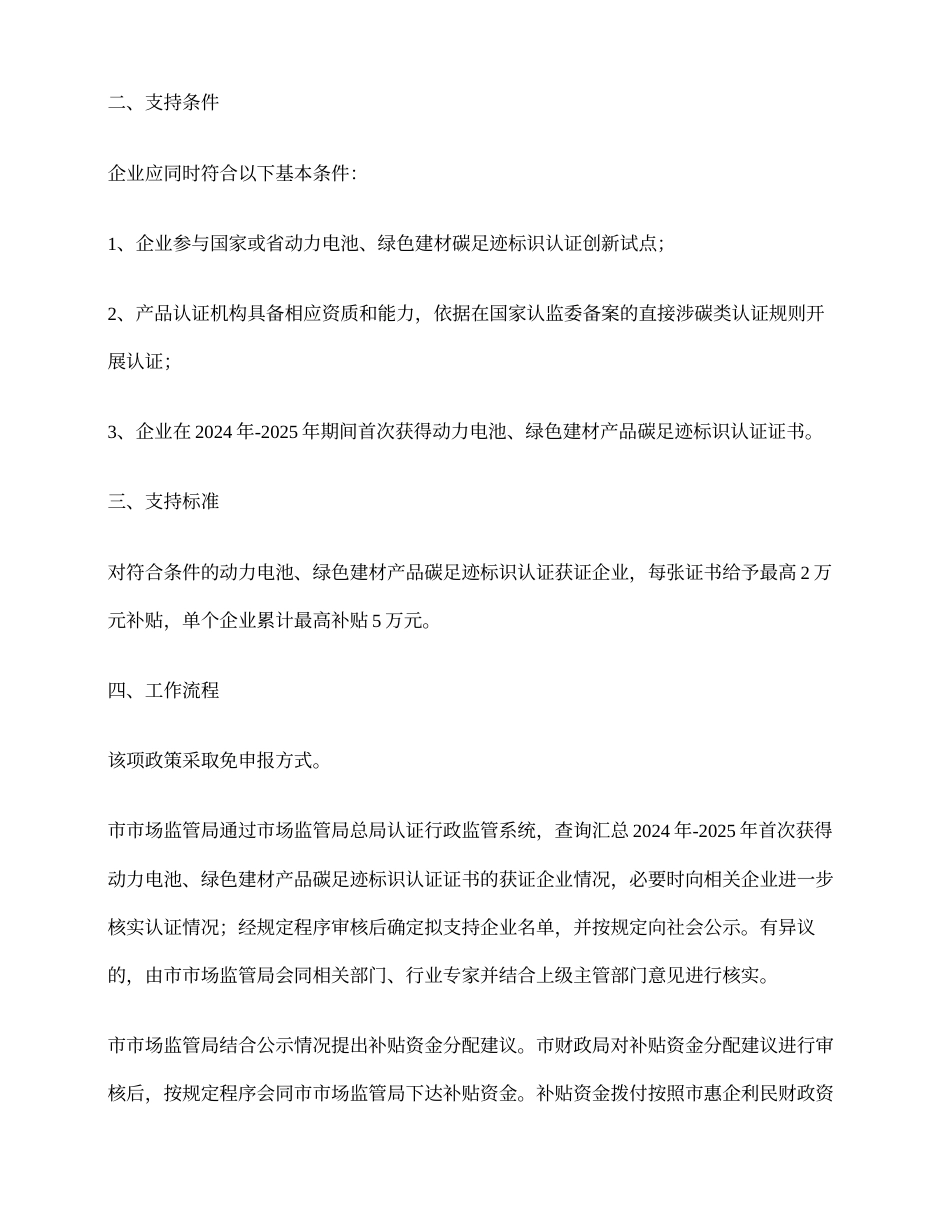 信息名称:关于印发《常州市产品碳足迹标识认证补贴实施细则》的通知索 引 号:MB1681397/2024-00078主题分类:其他 体裁分类:其他 组配分类:其他 市市场监管局:本机关政策文件文件编号:常市监〔2024〕34 号产生日期:2024-06-17发布机构:市市场监管局发布日期:2024-06-17废止日期:2026-06-17内容概述:关于印发《常州市产品碳足迹标识认证补贴实施细则》的通知附件下载:create_image.php?color=red&bg=white&word= 常 州市市场监督管理局文件附件下载:create_image.php?color=red&bg=white&word= 常 州市财政局文件常市监〔2024〕34 号关于印发《常州市产品碳足迹标识认证补贴实施细则》的通知各辖区市场监督管理局、财政局,常州经开区市场监督管理局、财政局,各有关单位: 现将《常州市产品碳足迹标识认证补贴实施细则》印发给你们,请认真组织实施。 常州市市场监督管理局 常州市财政局 2024 年 6 月 17 日 (此件公开发布) 常州市产品碳足迹标识认证补贴实施细则 为贯彻落实《常州市推动大规模设备更新和消费品以旧换新行动方案》(常政办发〔2024〕18 号),推动动力电池、绿色建材产业绿色低碳发展,引导和鼓励相关企业积极参与产品碳足迹标识认证创新试点工作,特制定本细则。 一、支持对象 在常州市区依法登记注册的企业。 二、支持条件 企业应同时符合以下基本条件: 1、企业参与国家或省动力电池、绿色建材碳足迹标识认证创新试点; 2、产品认证机构具备相应资质和能力,依据在国家认监委备案的直接涉碳类认证规则开展认证; 3、企业在 2024 年-2025 年期间首次获得动力电池、绿色建材产品碳足迹标识认证证书。 三、支持标准 对符合条件的动力电池、绿色建材产品碳足迹标识认证获证企业,每张证书给予最高 2 万元补贴,单个企业累计最高补贴 5 万元。 四、工作流程 该项政策采取免申报方式。 市市场监管局通过市场监管局总局认证行政监管系统,查询汇总 2024 年-2025 年首次获得动力电池、绿色建材产品碳足迹标识认证证书的获证企业情况,必要时向相关企业进一步核实认证情况;经规定程序审核后确定拟支持企业名单,并按规定向社会公示。有异议的,由市市场监管局会同相关部门、行业专家并结合上级主管部门意见进行核实。 市市场监管局结合公示情况提出补贴资金分配建议。市财政局对补贴资金分配建议进行审核后,按规定程序会同市市场监管局下达补贴资金。补贴资金拨付按照...