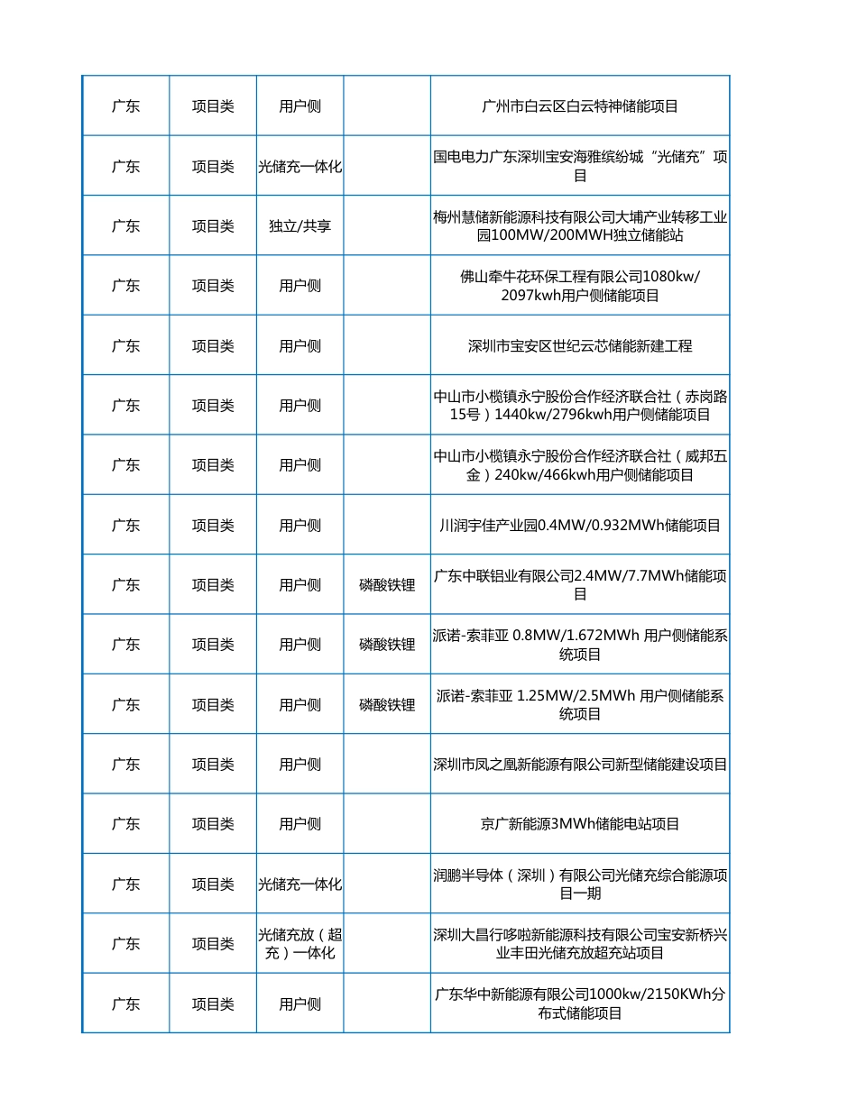 省份分类应用场景技术路线项目名称广东项目类用户侧广东项目类用户侧磷酸铁锂广东项目类用户侧广东项目类光储一体化广东项目类光储一体化广东项目类光储一体化广东项目类用户侧磷酸铁锂广东项目类光储充一体化锂电池广东项目类用户侧广东项目类用户侧广州市番禺区纬和服饰储能项目广东项目类光储充一体化广东项目类用户侧磷酸铁锂广东项目类用户侧磷酸铁锂2024年2月东莞市赛孚电子科技有限公司4000kw/h储能电站建设项目东莞万金高新产业园1.8MW/3.87MWh用户侧储能项目广东铂锦建设工程有限公司1mw/2.1mwh用户侧储能项目广宁县潭布镇古灶村电网末端改造“光储”电站综合利用项目广宁县潭布镇前垌村电网末端改造“光储”电站综合利用项目广宁县潭布镇中华村电网末端改造“光储”电站综合利用项目江门市江明不锈钢材料有限公司230KW/464KWh用户侧储能项目中国石化销售股份有限公司广东惠州惠东长东光储充综合加能站项目中山国泰染整有限公司2280kw/4427kwh用户侧储能项目惠东白花大富盈购物广场328KW光储充一体化项目东莞市红禾包装制品有限公司100KW/232Kwh用户侧储能电站项目佛山市顺德区昕晟晖新能源有限公司江门台山0.25MW/0.5MWh储能项目广东项目类用户侧广州市白云区白云特神储能项目广东项目类光储充一体化广东项目类广东项目类用户侧广东项目类用户侧深圳市宝安区世纪云芯储能新建工程广东项目类用户侧广东项目类用户侧广东项目类用户侧广东项目类用户侧磷酸铁锂广东项目类用户侧磷酸铁锂广东项目类用户侧磷酸铁锂广东项目类用户侧深圳市凤之凰新能源有限公司新型储能建设项目广东项目类用户侧广东项目类光储充一体化广东项目类广东项目类用户侧国电电力广东深圳宝安海雅缤纷城“光储充”项目独立/共享梅州慧储新能源科技有限公司大埔产业转移工业园100MW/200MWH独立储能站佛山牵牛花环保工程有限公司1080kw/2097kwh用户侧储能项目中山市小榄镇永宁股份合作经济联合社(赤岗路15号)1440kw/2796kwh用户侧储能项目中山市小榄镇永宁股份合作经济联合社(威邦五金)240kw/466kwh用户侧储能项目川润宇佳产业园0.4MW/0.932MWh储能项目广东中联铝业有限公司2.4MW/7.7MWh储能项目派诺-索菲亚0.8MW/1.672MWh用户侧储能系统项目派诺-索菲亚1.25MW/2.5MWh用户侧储能系统项目京广新能源3MWh储能电站项目润鹏半导体(深圳)有限公司光储充综合能源项目一期光储充放(超充)一体化深圳大昌行哆啦新能源科技有限公司宝安新桥兴业丰田光储充放超充站项目广东华中新能源有限公司1000kw/2150KWh分布式储能项目广东项目类用户侧广东项目类光储一体化深圳鸿信科技园分布式光储一体化智慧能源项目广东项目类光储一体化广东项目类光储充一体化中国石化惠深加油站光储充一体化建设项目广东项目类广东项目类磷酸铁锂广东项目类用户侧磷酸铁锂广东项目类用户侧磷酸铁锂广东项目类电网侧磷酸铁锂广东项目类光储一体化广东项目类光储充一体化丰禾新能源龙溪充电站光储充项目广东项目类用户侧广东项目类磷酸铁锂佛山市高明独立储能项目广东项目类用户侧磷酸铁锂广东项目类光储一体化广东项目类光储一体化江门市新会区双水焕发轧钢厂360KW/699KWh用户侧储能项目深圳市太子湾DY04-0506项目44KWp屋面分布式光伏储能工程独立/共享惠州日盛新能源有限公司惠州市博罗县200MW/400MWh独立共享储能电站项目独立/共享清远市粤新能源科技有限公司600MW/1200MWh独立储能项目东莞市同正物业管理有限公司2MW/4MWh用户储能项目汕头经济特区超艺螺丝万吉工厂1.29MWh储能电站协鑫广州增城荔湖100MW/200MWh电网侧储能电站项目中山市港牌投资管理有限公司200KW屋顶分布式光伏发电与400KWH储能项目东莞市元圆源电子有限公司720kw/1398kwh用户侧储能项目独立/共享广东加福加德食品有限公司0.48MW/1.032MWh储能电站项目怀集县汶朗镇汶塘村电网末端改造“光储”电站综合利用项目深圳鸿创科技中心分布式光储一体化智慧能源项目广东项目类光储充一体化广东项目类用户侧磷酸铁锂广东项目类用户侧锂电池广东项目类用户侧广东项目类光储一体化广东项目类广东项目类用户侧广东项目类用户侧广东项目类用户侧广东产业类广东产业类广东项目...