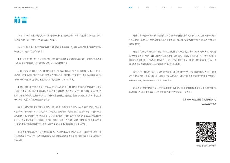 前言1一、趋势:快速发展的ESG评级3附录:调研名单(排名不分先后)29参考资料31二、现状:中国ESG评级的理想与现实11三、展望:共建ESG评级生态圈25(一)监管部门:引导支撑为主,完善配套建设26(二)行业组织:促进对话交流,加强行业自律26(三)评级机构:利用多种手段,优化评价方法26(五)金融机构:强化ESG分析,创新使用场景27(四)被评企业:纳入日常运营,做实管理和披露27(二)中国ESG评级的理想期待20(三)中国ESG评级的现实挑战22(二)全球ESG评级监管动态81.监管趋势82.关键原则9(一)ESG评级概念与功能31.历史发展32.主流机构43.关键作用6(一)解码中国ESG评级机构121.核心目的122.应用模式133.产品类型144.评价体系165.可靠性保障19目录21中国ESG评级观察报告(2024)前言趋势现状展望附录参考资料20年前,联合国全球契约组织首次提出ESG概念,要求金融市场将环境、社会和治理因素引入分析,强调“在乎者胜”(WhoCaresWin)。20年间,从企业社会责任到可持续发展,从绿色金融到ESG,商业的评价逻辑不再局限于财务指标,有了更多“在乎”的内容。ESG旨在促进社会经济可持续发展,与当前中国高质量发展要求高度契合,在国家提出“碳达峰、碳中和”目标后,其价值日益凸显,讨论热度持续升温。不同于财务评价体系,ESG体系内容庞杂,有正面、有负面,有长期、有短期,环境、社会、治理议题下的指标彼此关联性不高,有些甚至相互矛盾,这给ESG更接地气、更清晰地被理解、接纳和实践带来阻碍,也增加了利益相关方判别企业ESG水平的难度。ESG评级机构在这种背景下应运而生,对标全球通行的可持续发展信息披露准则,开发ESG评价体系,利用多种渠道获取、处理企业ESG信息,再由专业人员判别和审核,最后给出企业ESG等级和分数,这些评级产品和数据被金融机构、投资者、企业、高校使用,成为判定企业ESG风险和可持续价值的重要参考依据。商业发展似乎跳出了“唯利是图”的评价逻辑,在往更高质量的方向发展了。然而,现实却不容乐观。由于国内ESG评价起步晚、信息披露基础薄弱、数据实效待验证等问题,目前市场上ESG评级仍然以海外机构“马首是瞻”,对国内评级机构的可靠性多有质疑;在ESG持续升温背景下,不少企业对ESG评价体系不甚了解、只盲目追求一个分数,忽略了自身ESG管理能力的建设;ESG金融产品也只局限于试点和小圈子,ESG在更多投融资场景应用待深入。这是新事物发展过程中必将经历的曲折。中国市场ESG评价工作还处于初级阶段,已有一批机构开始摸着石头过河,从搭建数据库和构建评价体系两条路径入手,试图为商业注入道德和责任的血液。这些机构开展ESG评级的初衷是什么?它们采取何种商业模式?它们如何认识中国ESG评级存在的问题?如何应对种种质疑和挑战?相比传统评级的作用,专家和学者对中国ESG评级又有哪些新期待?这是本次研究试图回应的问题。我们以结构性访谈为主,包括书面访谈和电话访谈,尽可能完全地覆盖当前中国开展ESG评级的机构和组织(见附录),因此,目标对象不限于咨询机构、数据公司、金融机构,还有政府和能源企业。由于时间和能力关系,部分机构未能覆盖到,留下遗憾,希望后续在对该议题的持续跟踪进程中,有机会弥补。本报告的目的不在于逐一介绍当前中国ESG评级机构的产品、评级体系的指标内容,而是选取几个侧面了解评价者、使用者、观察者的立场和观点,以为中国ESG生态圈中的相关方提供不同的思考角度,为未来发展指引方向、凝聚力量。由衷感谢积极支持本次调研的专家和机构,我们从不同类型的机构和学者身上获益良多,很高兴能作为见证者和传播者,为共建中国ESG良性生态贡献一份力量。扫码了解各方访谈详情南方周末中国企业社会责任研究中心二〇二四年七月前言43前言趋势现状展望附录参考资料中国ESG评级观察报告(2024)随着气候变化、社会公平及企业透明度等议题日益受到全球关注,投资者和消费者对于企业的期望已不再局限于经济利润的增长,而是更加看重其在促进环境保护、维护社会公正及提升治理水平方面的表现。这一趋势推动了ESG评级市场的发展,各类专业机构纷纷推出详尽的ESG评价标准与工具,帮助市场参与者识别并投资于那些具...