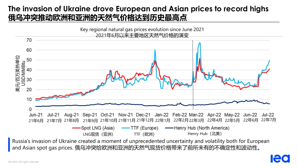 IEA2022.Allrightsreserved.Gas2022andMarketUpdate天然气2022与市场更新Jean-BaptisteDUBREUIL,SeniorGasAnalystJean-BaptisteDUBREUIL,天然气高级分析师IEA2022.Allrightsreserved.TheinvasionofUkrainedroveEuropeanandAsianpricestorecordhighs俄乌冲突推动欧洲和亚洲的天然气价格达到历史最高点Russia’sinvasionofUkrainecreatedamomentofunprecedenteduncertaintyandvolatilitybothforEuropeanandAsianspotgasprices.俄乌冲突给欧洲和亚洲的天然气现货价格带来了前所未有的不确定性和波动性。KeyregionalnaturalgaspricesevolutionsinceJune20212021年6月以来主要地区天然气价格的演变美元/百万英热单位LNG现货(亚洲)TTF(欧洲)HenryHub(北美)21年6月21年7月21年8月21年9月21年10月21年11月21年12月22年1月22年2月22年3月22年4月22年5月22年6月22年7月IEA2022.Allrightsreserved.GlobalLNGtradeincreasedbyover4%y-o-yinH1上半年全球液化天然气贸易量同比增长超过4%USLNGrampupaccountedforcloseto90%oftotalsupplyincreaseinthefirsthalfof2022;2022年上半年,美国液化天然气的增量占总供应量增加的近90%。Europe’simportsgrewby50%y-o-yoverthesameperiod.同期,欧洲的进口量同比增长50%。LNGsupplyevolution(Jan-Jun),2021-20222021-2022年液化天然气供应变化(1-6月)LNGdemandpermainmarket(Jan-Jun),2021-20222021-2022年各主要市场的液化天然气需求(1-6月)10亿立方米美国其他全球日本&韩国亚洲其他地区中国欧洲其他2022年1-6月2021年1-6月IEA2022.Allrightsreserved.Europe’sincrementalsupplyneedsdriveLNGgrowthandtightness欧洲的增量供应需求推动了液化天然气的增长和紧缺GlobalLNGtradeflowsreconfigurein2022asEuropebecomesthepremiummarketforLNG.2022年全球液化天然气贸易流向重新配置,欧洲成为液化天然气的溢价市场。GlobalLNGbalance,y-o-ychange,2021-20222021-2022年全球液化天然气平衡表(同比变化)10亿立方米进口出口欧洲亚洲其他地区全球天然气贸易美国其他IEA2022.Allrightsreserved.Globalgasgrowthrateisexpectedtoturnnegativein2022预计2022年全球天然气增长率将转为负值AsiaPacificdemandincreaseiscappedbytensionsonaccesstosupply,whileEuropeangasconsumptionisforeseentoplungebelowits2020level.亚太地区的需求增长因供应紧张而受到限制,而欧洲的天然气消费预计将暴跌至低于2020年的水平。Changeingasdemandbyregion,2021-20222021-2022年各地区天然气需求变化全球北美中东欧洲欧亚中南美亚太非洲发电工业住宅和商业能源部门交通2021-2022年净增长10亿立方米IEA2022.Allrightsreserved.Short-termgrowthcomestoahalt,uncertaintylimitsgrowthpotentialto2025短期增长停滞不前,不确定性限制了2025年的增长潜力Currentmarkettensionsandmedium-termuncertaintyresultina60%cutinourforecastofaveragegrowthingasdemandto2024,comparedtoourpreviousoutlook.目前市场的紧张局势和中期的不确定性,导致我们对2024年之前天然气需求平均增长的预测与之前的展望相比削减了60%。EvolutionofglobalgasdemandforecastsinthethreelatestissuesoftheIEAmedium-termgasreport国际能源署最新三期天然气中期报告中全球天然气需求预测的演变10亿立方米2020年天然气报告2021年天然气报告2022年天然气报告2021-2024年复合年增长率IEA2022.Allrightsreserved.Growthrecoveryisslowandprogressive,ledbyAsia增长复苏是缓慢而渐进的,由亚洲主导LowerglobalgasgrowthpotentialfurtherhighlightstheoutsizeroleplayedbyAsiaandtheindustrialsectorinthemedium-termconsumptionincrease.全球天然气增长潜力的降低进一步凸显了亚洲和工业部门在中期消费增长中发挥的巨大作用。Breakdownofforecastgrowthinglobalnaturalgasdemand,2021-20252021-2025年全球天然气需求增长预测细分表Byyear按年份Bysector按部门Byregion按区域10亿立方米2021-2025年净增长交通能源部门工业住宅和商业发电2021-2025年净增长北美中东欧洲欧亚中南美亚太非洲2021-2025年...