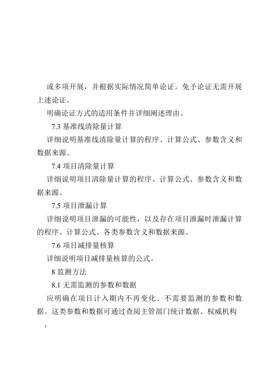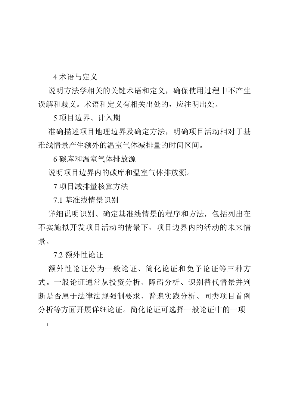 附件1四川省林草碳普惠项目方法学编制大纲一、四川省林草碳普惠项目方法学XXX(项目类型)格式要求:按照GB/T1.1-2020《标准化工作导则第1部分:标准的结构和编写》的格式要求。1引言清晰描述方法学所指项目,说明方法学的用途及编制单位。说明方法学是新的方法学,还是已备案方法学修订。若是已备案方法学修订,还应说明被修订的方法学名称、版本号,以及修订完善的主要内容、修订理由。2适用条件明确方法学适用的项目条件,包括项目活动必须满足的具体技术条件,如有方法学不适用的特定情况或情景应具体说明。3规范性引用文件列明需要配套引用或使用的技术标准和技术规范。14术语与定义说明方法学相关的关键术语和定义,确保使用过程中不产生误解和歧义。术语和定义有相关出处的,应注明出处。5项目边界、计入期准确描述项目地理边界及确定方法,明确项目活动相对于基准线情景产生额外的温室气体减排量的时间区间。6碳库和温室气体排放源说明项目边界内的碳库和温室气体排放源。7项目减排量核算方法7.1基准线情景识别详细说明识别、确定基准线情景的程序和方法,包括列出在不实施拟开发项目活动的情景下,项目边界内的活动的未来情景。7.2额外性论证额外性论证分为一般论证、简化论证和免予论证等三种方式。一般论证通常从投资分析、障碍分析、识别替代情景并判断是否属于法律法规强制要求、普遍实践分析、同类项目首例分析等方面开展详细论证。简化论证可选择一般论证中的一项1或多项开展,并根据实际情况简单论证。免予论证无需开展上述论证。明确论证方式的适用条件并详细阐述理由。7.3基准线清除量计算详细说明基准线清除量计算的程序、计算公式、参数含义和数据来源。7.4项目清除量计算详细说明项目清除量计算的程序、计算公式、参数含义和数据来源。7.5项目泄漏计算详细说明项目泄漏的可能性,以及存在项目泄漏时泄漏计算的程序、计算公式、各类参数含义和数据来源。7.6项目减排量核算详细说明项目减排量核算的公式。8监测方法8.1无需监测的参数和数据应明确在项目计入期内不再变化、不需要监测的参数和数据。这类参数和数据可通过查阅主管部门统计数据、权威机构1研究报告、国内外文献等文件的方式获取。方法学应详细说明参数和数据的名称、描述、单位、来源、选用合理性、用途等。无需监测的参数和数据列表数据/参数名称应用的公式编号数据描述数据单位数据来源研究报告、试验数据、统计数据、行业经验值等,并提出选取优先序。数据选用的合理性对于采用缺省值的,应说明参数缺省值选取依据及合理性。数值(如有)数据用途备注8.2需要监测的参数和数据明确在项目需进行监测的参数和数据。这类参数和数据可通过实际监测、统计核算、问卷调查等方式获取,数据更新周期1一般至少为一年(具体参数和数据如有不同的周期要求应分别明确)。方法学应详细说明参数和数据的名称、描述、单位、来源、监测要求、质量保证与质量控制程序、用途等。尽可能提供上述参数和数据的工况数据链接或区块链等信息技术保存有关存证材料的可行途径,通过信息化手段确保数据质量。需要监测的参数和数据列表数据/参数名称应用的公式编号数据描述数据单位数据来源监测点要求监测仪表要求监测程序与方法要求监测频次与记录要求质量保证/质量控制程序要求数据用途1备注8.3项目实施及监测的数据管理要求详细说明项目实施及监测计划实施应做好的数据管理及数据质量控制的存档要求,以满足项目审定、减排量核算与核查需求。包括:基准线情景下清除量监测、项目活动监测、项目边界监测、项目分层、抽样设计、样地设置、监测频率、非持久性影响及措施、数据管理与归档要求等。9项目审定与减排量核查要点为确保项目及减排量的真实性、准确性、保守性,方法学应说明针对本方法学适用的项目审定、减排量核查要点。重点应针对项目真实性、项目边界及排放源准确性、减排量核算方法的准确性、核算参数及结果的保守性等方面,说明需要审定与核查的重点内容、数据参数,明确审定与核查可得的数据源、参考文献、抽样比例、交叉验证途径等。附录包括规范性附录(给出正文的补充或附加条款)和资料性附录(给出有助于...