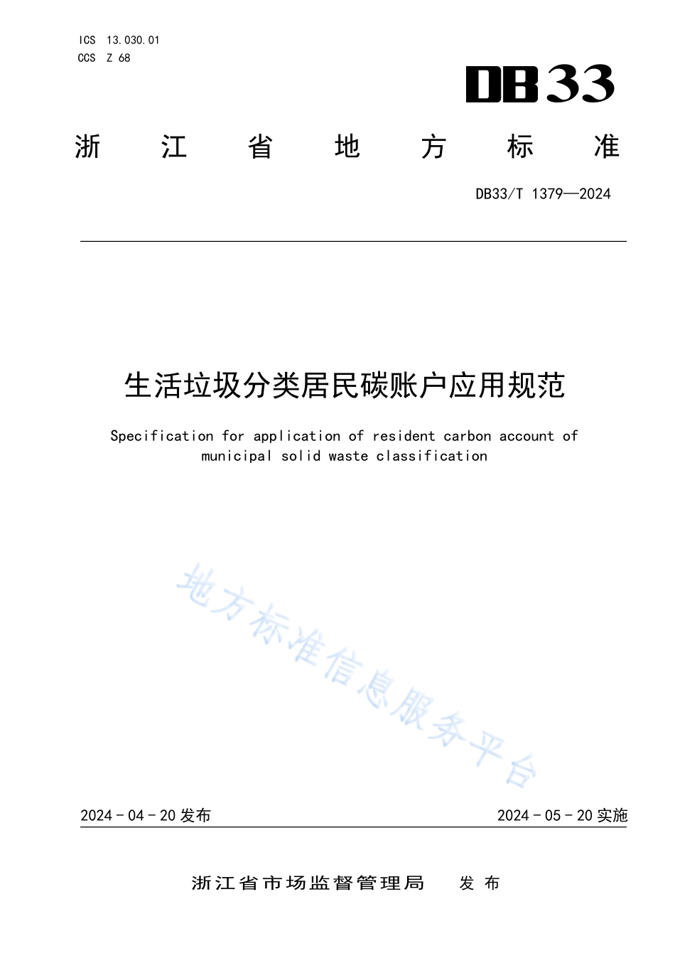 ICS13.030.01CCSZ6833浙江省地方标准DB33/T1379—2024生活垃圾分类居民碳账户应用规范Specificationforapplicationofresidentcarbonaccountofmunicipalsolidwasteclassification2024-04-20发布2024-05-20实施浙江省市场监督管理局发布DB33/T1379—2024I前言本标准按照GB/T1.1—2020《标准化工作导则第1部分:标准化文件的结构和起草规则》的规定起草。请注意本标准的某些内容可能涉及专利。本标准的发布机构不承担识别专利的责任。本标准由浙江省住房和城乡建设厅提出、归口并组织实施。本标准起草单位:衢州市柯城区人民政府、浙江大学、浙江省标准化研究院、浙江省生态环境科学设计研究院、浙江省城市化发展研究中心、浙江工业大学、浙江浙能碳资产管理有限公司、浙江南研能源技术有限公司、浙江传超环保科技有限公司、浙江虎哥环境有限公司、浙江联运知慧科技有限公司、上海环境卫生工程设计院有限公司、浙江大学长三角智慧绿洲创新中心。本标准主要起草人:吴伟祥、曲洪娟、葛恩燕、蒋智勇、应珊婷、徐志荣、强子墨、陈红英、吕鹏飞、朱颜、蔡传钰、胡健、姜国兴、贾佳、卓明、余燕珍、董青青、邰俊、王佳颖、李馨予、余晓霞、周敏、陈增丰、秦勇、章古月。DB33/T1379—20241生活垃圾分类居民碳账户应用规范1范围本标准规定了生活垃圾分类居民碳账户的应用流程、数据采集、碳减排量核算、碳积分赋值与应用等内容。本标准适用于城镇生活垃圾智能分类投放模式与统收模式下的居民碳账户的建立与应用。2规范性引用文件下列文件中的内容通过文中的规范性引用而构成本标准必不可少的条款。其中,注日期的引用文件,仅该日期对应的版本适用于本标准;不注日期的引用文件,其最新版本(包括所有的修改单)适用于本标准。GB/T35273信息安全技术个人信息安全规范GB/T41479信息安全技术网络数据处理安全要求GB/T41818—2022信息技术大数据面向分析的数据存储与检索技术要求DB33/T1166城镇生活垃圾分类标准DB33/T2487公共数据安全体系建设指南3术语和定义DB33/T1166界定的以及下列术语和定义适用于本标准。3.1生活垃圾分类居民碳账户residentcarbonaccountofmunicipalsolidwasteclassification以户为单位计算居民生活垃圾分类行为碳减排成果的记账单元。3.2碳排放carbonemission在特定时间段内释放到大气中的温室气体总量(以质量单位计算)。[来源:GB/T33760—2017,3.3,有修改]3.3碳减排量carbonemissionreduction经计算得到的一定时期内所产生的温室气体排放量与基准线情景排放量相比的减少量(以CO2当量计)。[来源:GB/T33760—2017,3.5,有修改]3.4智能分类投放模式smartclassificationdepositionmode以户为单位,将生活垃圾按照可回收物、易腐垃圾、其他垃圾和有害垃圾进行分类,投放至智能分类回收设备,并进行计量的方式。3.5统收模式unificationcollectionmode由专业机构以户为单位统一上门收集生活垃圾中的可回收物和有害垃圾,并进行计量的方式。DB33/T1379—202424生活垃圾分类居民碳账户应用流程生活垃圾分类居民碳账户的应用流程包括居民碳账户信息收集、数据采集与管理、碳减排量核算、碳积分赋值和碳积分应用,具体流程见图1。图1生活垃圾分类居民碳账户建立与应用流程图5居民碳账户信息收集以户为单位在相关数字化平台上注册生成生活垃圾分类居民碳账户。5.1生活垃圾分类居民碳账户应包括以下内容:5.2——户主、门牌号等基本信息;——生活垃圾类型、重量、投放时间等分类投放信息;——生活垃圾分类碳减排量信息;——生活垃圾分类碳积分与应用信息。6数据采集与管理数据采集6.16.1.1智能分类投放模式下,数据采用自动采集方式。由配备的智能称重设备采集居民投放的易腐垃圾、可回收物、有害垃圾和其它垃圾四类生活垃圾的重量数据。6.1.2统收模式下,数据采用人工采集方式。由经培训后的作业人员采集居民分类后的可回收物和有害垃圾的重量数据。6.1.3由生活垃圾分类收集企业或管理部门汇总采集数据,导入并及时上传至居民碳账户。6.1.4数字化平台对上传的数据进行检验、校核、汇总、统计分析,符合GB/T41818—2022中8.3数据处理的要求。数据管理6.26.2.1按照DB33/T2...