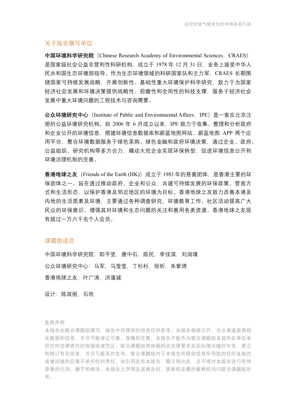 应对全球气候变化的中国务实行动应对全球气候变化的中国务实行动(初稿)二〇二三年十一月应对全球气候变化的中国务实行动关于报告撰写单位中国环境科学研究院(ChineseResearchAcademyofEnvironmentalSciences,CRAES)是国家级社会公益非营利性科研机构,成立于1978年12月31日,业务上接受中华人民共和国生态环境部指导。作为生态环境领域的科研国家队和主力军,CRAES长期围绕国家可持续发展战略,开展创新性、基础性重大环境保护科学研究,致力于为国家经济社会发展和环境决策提供战略性、前瞻性和全局性的科技支撑,服务于经济社会发展中重大环境问题的工程技术与咨询需要。公众环境研究中心(InstituteofPublicandEnvironmentalAffairs,IPE)是一家在北京注册的公益环境研究机构。自2006年6月成立以来,IPE致力于收集、整理和分析政府和企业公开的环境信息,搭建环境信息数据库和蔚蓝地图网站、蔚蓝地图APP两个应用平台,整合环境数据服务于绿色采购、绿色金融和政府环境决策,通过企业、政府、公益组织、研究机构等多方合力,撬动大批企业实现环保转型,促进环境信息公开和环境治理机制的完善。香港地球之友(FriendsoftheEarth(HK))成立于1983年的慈善团体,是香港主要的环保团体之一。旨在透过推动政府、企业和公众,共建可持续发展的环保政策、营商方式和生活形态,以保护香港及邻近地区的环境为目标。香港地球之友致力改善本港及内地的生活质素及环境,主要通过各种调查研究、环境教育工作、社区活动提高广大民众的环保意识、增强其对环境和生态问题的关注和善用各类资源。香港地球之友现有超过一万六千名个人会员。课题组成员中国环境科学研究院:阳平坚,唐中石,陈民,李佳淇,刘润璞公众环境研究中心:马军,马莹莹,丁杉杉,徐昕,朱紫琦香港地球之友:叶广涛,洪蔼诚设计:陈双丽,石欢免责声明本报告由联合课题组撰写,报告中所提供的信息仅供参考。本报告根据公开、合法渠道获得相关数据和信息,并尽可能保证可靠、准确和完整。本报告不能作为联合课题组及其所在单位承担任何法律责任的依据或者凭证。联合课题组将根据相关法律要求及实际情况随时补充、更正和修订有关信息,并尽可能及时发布。联合课题组对于本报告所提供信息所导致的任何直接的或者间接的后果不承担任何责任。如引用发布本报告,需注明出处,且不得对本报告进行有悖原意的引用、删节和修改。本报告之声明及其修改权、更新权及最终解释权均归联合课题组所有。应对全球气候变化的中国务实行动i执行摘要近年来,全球高温、热浪、山火、干旱、洪涝等极端天气频发,气候影响不断加剧。值此关键时刻,《巴黎协定》的首次全球盘点(GlobalStocktake)将在COP28上进行。气候变化是事关全人类的危机,必须多元参与,协同治理。作为非政府组织和公众一员,我们同样对气候变化怀有极大的热忱,愿意从非官方的视角对身边正在发生的应对气候变化行动做出盘点。为此中国环境科学研究院、公众环境研究中心和香港地球之友成立联合课题组,共同研究并发布《应对全球气候变化的中国务实行动》报告。初步盘点结果显示,《巴黎协定》已促使全球重视气候危机,超过150个国家做出碳中和承诺;但在行动层面,虽然有所进展,但还远远不足以应对严峻气候形势1,全球温室气体排放连续两年不减反增。对此,课题组认为首次全球盘点是否能够成为落实《巴黎协定》的关键转折,取决于如何以推动落实为出发点,聚焦各缔约国履约行动,推动就2030年前及之后的解决方案达成一致。作为负责任的发展中国家,中国正在全球气候治理中发挥重要参与者、贡献者和引领者的作用。2020年9月22日习近平主席在第七十五届联合国大会上代表中国提出力争2030年前实现碳达峰、2060年实现碳中和的目标。“双碳”目标的提出,是中国对世界发出的庄严承诺,是中国最高决策层统筹国内国际两个大局,经过深思熟虑作出的重大战略决策,是中国积极应对全球气候危机、着力推动构建人类命运共同体的担当体现。联合课题组基于公开收集的资料和数据,总结了中国为应对气候变化、落实碳达峰碳中和承诺而采取的十大务实行动,分析了中国如何开展以制定“1+N”...
