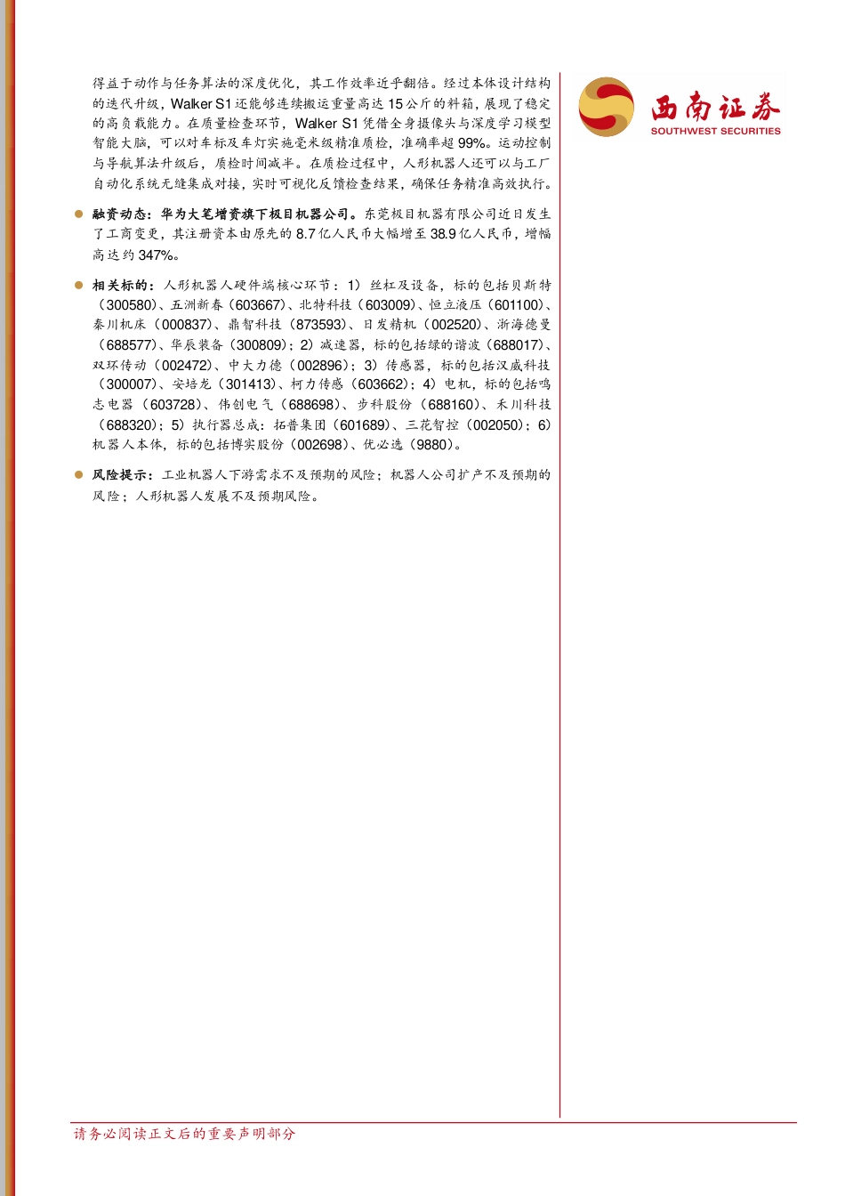 请务必阅读正文后的重要声明部分[Table_IndustryInfo]2024年12月15日强于大市(维持)证券研究报告•行业研究•机械设备机器人行业周报(1209-1215)Optimus展示崎岖地形稳健行走,自主行走能力再升级投资要点西南证券研究发展中心[Table_Author]分析师:邰桂龙执业证号:S1250521050002电话:021-58351893邮箱:tgl@swsc.com.cn分析师:周鑫雨执业证号:S1250523070008电话:021-58351893邮箱:zxyu@swsc.com.cn联系人:叶明辉电话:13909990246邮箱:ymh@swsc.com.cn[Table_QuotePic]行业相对指数表现数据来源:聚源数据基础数据[Table_BaseData]股票家数438行业总市值(亿元)35,672.21流通市值(亿元)34,671.48行业市盈率TTM32.5沪深300市盈率TTM12.7相关研究[Table_Report]1.通用设备月报(1101-1130):11月制造业PMI为50.3%,需求修复在路上(2024-12-09)2.机器人行业周报(1202-1208):川渝政府发布聚身智能相关文件,聚焦人工智能与机器人(2024-12-08)3.机器人行业周报(1125-1201):Optimus展示新一代灵巧手接球,人形机器人技术加速迭代(2024-12-02)[Table_Summary]行情回顾:本周(12月9日-12月15日)机器人指数跑赢大盘。中证机器人指数下跌0.3%,跑赢上证指数0.03个百分点,跑赢沪深300指数0.7个百分点,跑赢创业板指1.1个百分点。特斯拉Optimus展现崎岖地形行走能力,未依赖视觉系统。12月10日,特斯拉发布了一段视频,展示了其人形机器人Optimus在复杂崎岖地形上的行走能力。视频中,Optimus在山丘斜坡上稳健行走,不仅能上坡,还能下坡。马斯克表示,Optimus能够依靠神经网络控制其电动肢体,在不依赖远程操控的情况下,自主应对这种复杂地形。特斯拉Optimus工程副总裁MilanKovac表示机器人在行走过程中并未使用视觉系统,而是完全依靠传感器和运行的神经网络。他提到自己曾在Optimus行走的位置滑倒,进一步凸显了该地形的复杂性和机器人行走能力的出色表现。MilanKovac还表示,计划在未来为Optimus增加视觉系统,并持续改进其行走姿态、响应速度以及跌倒恢复能力,以提升机器人的整体性能。广汽集团展示第二代具身智能机器人,全新人形机器人将于今年底正式对外发布。12月8-9日,由广汽集团自主研发的第二代具身智能机器人在明珠湾国际气候投融资大会亮相。目前,广汽机器人研发已进入第三代,全新人形机器人将于今年底正式对外发布。根据广汽机器人研发团队,广汽具身智能机器人采用可变轮足移动结构,具备全地形通行能力,可自由切换两轮足或四轮足模式;搭载具有视觉、触觉系统的灵巧手,具备力反馈功能,能够完成多场景服务;引入人工智能大模型,可实现远程操控、本地控制和自主控制;使用纯电驱动,续航超过6小时。英伟达重磅发布NaVILA:宇树Go2、G1等机器人导航成功率达88%。近期,英伟达联手加州大学研究团队发布了全新的NaVILA模型,一举突破了机器人实时决策的技术瓶颈。这个模型让机器人摆脱了对预设地图的依赖,仅凭自然语言指令和实时视觉信息就能自如导航。在使用宇树Go2机器狗和G1人形机器人进行的测试中,NaVILA在室内、户外等真实场景中的导航成功率高达88%,就连面对复杂任务时也能保持75%的成功率。傅利叶发布GRx人形机器人应用解决方案——导览咨询场景。GRx系列人形机器人以亲和的形象和拟人化的人机互动,完成信息咨询、吸引关注等任务,并支持多语言环境,助力商业客户提升服务效率和终端用户体验,实现差异化营销。应用案例包括商业银行大堂经理、汽车4S店销售服务等。优必选人形机器人WalkerS1助力极氪第40万台汽车下线。今年7月,优必选工业人形机器人WalkerSLite“入职”极氪智慧工厂并进行了连续21天的“实训”,在CTU入库上料工位协同员工执行搬运任务。近日,全新升级的工业人形机器人WalkerS1再次进入极氪智慧工厂开启第二阶段的实训,不仅在智能搬运工作中实现了全新升级,搬运速度提升约25%,还完成了质量检查等新任务。相较于第一阶段的实训经历,WalkerS1此次的工作范围扩大了30%,-24%-14%-4%6%16%26%23/1224/224/424/624/824/1024/12机械设备沪深300请务必阅读正文后的重要声明部分得益于动作与任务算法的深...