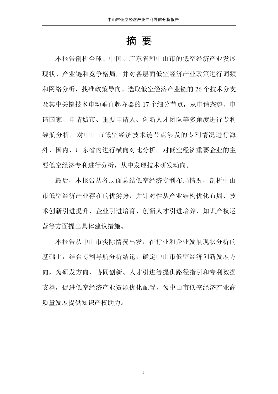中山市低空经济产业专利导航分析报告中山市知识产权保护中心广州合享新创信息科技有限公司2024年11月中山市低空经济产业专利导航分析报告I摘要本报告剖析全球、中国、广东省和中山市的低空经济产业发展现状、产业链和竞争格局,并对各层面低空经济产业政策进行词频和网络分析,找准政策导向。选取低空经济产业链的26个技术分支及其中关键技术电动垂直起降器的17个细分节点,从申请态势、申请国家、申请城市、重要申请人、创新人才团队等多角度进行专利导航分析。对中山市低空经济技术链节点涉及的专利情况进行海外、国内、广东省内进行横向对比分析。对低空经济重要企业的主要低空经济专利进行分析,从中发现技术研发动向。最后,本报告从各层面总结低空经济专利布局情况,剖析中山市低空经济产业存在的优劣势,并针对性从产业结构优化布局、技术创新引进提升、企业引进培育、创新人才引进培养、知识产权运营等方面提出具体建议措施。本报告从中山市实际情况出发,在行业和企业发展现状分析的基础上,结合专利导航分析结论,确定中山市低空经济创新发展方向,为研发方向、协同创新、人才引进等提供路径指引和专利数据支撑,促进低空经济产业资源优化配置,为中山市低空经济产业高质量发展提供知识产权助力。中山市低空经济产业专利导航分析报告II目录第一章引言..........................................................................................................11.1研究目的.................................................................................................11.2研究方法.................................................................................................21.3数据来源.................................................................................................31.4专利检索策略.........................................................................................31.5相关说明.................................................................................................31.5.1数据完整性..................................................................................31.5.2单位“件”与“项”..................................................................31.5.3关于“中国专利”的约定..........................................................41.5.4术语解释......................................................................................4第二章低空经济概述..........................................................................................52.1低空经济概念.........................................................................................52.1.1低空空域定义..............................................................................52.1.2低空经济概念的提出背景与发展.............................................62.1.3低空经济的本质特征与定义......................................................72.2低空经济产业链.....................................................................................82.2.1产业链图谱..................................................................................82.2.2上游航材及核心设备情况..........................................................92.2.3中游装备制造及配套服务情况................................................212.2.4下游分析....................................................................................302.3低空经济技术链...................................................................................372.3.1技术链图谱................................................................................372.3.2全球专利技术申请趋势............................................................392.3...