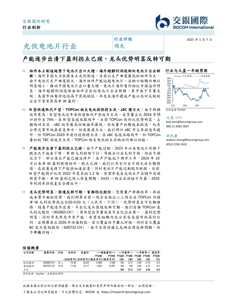 此报告最后部分的分析师披露、商业关系披露和免责声明为报告的一部分,必须阅读。下载本公司之研究报告,可从彭博信息:BOCM或https://research.bocomgroup.com此报告最后部分的分析师披露、商业关系披露和免责声明为报告的一部分,必须阅读。下载本公司之研究报告,可从彭博信息:BOCM或https://research.bocomgroup.com交银国际研究行业剖析2025年1月7日产能逐步出清下盈利拐点已现,龙头优势明显反转可期组件本土制造趋势下电池片出口大增,海外超额利润逐渐向电池片企业转移:海外多国大力扶持本土光伏制造,目前以生产难度最低的组件为主,由于电池片生产难度较大,海外组件产能远超电池片,且缺口短期内难以明显缩小,推动中国电池片出口量大增。电池片海外售价相比中国溢价明显,海外超额利润逐渐由组件企业向电池片企业转移,其中由于多重关税,美国市场售价远远高于其他地区,率先在海外建成产能以应对关税的企业可享受其高单W盈利。N型快速取代P型,TOPCon相关电池将保持主流,xBC潜力大:由于转换效率更高,N型电池近年来快速取代P型成为主流,出货量占比2024年预计将升至74%。在N型各技术路线中,目前TOPCon性价比优势明显,占据绝对主流,xBC效率最高但双面率最低,尚处量产初期成本较高,仅在分布式等市场具有竞争力,但发展潜力大。我们预计xBC市占率将逐年提升,但TOPCon2029年前仍将保持主流,在xBC各技术路线中,和TOPCon叠加的TBC将成为主流,TOPCon相关电池的主流地位仍难以动摇。产能逐步出清下盈利拐点已现:由于产能过剩,2023年以来电池片价格下跌且大于成本下降,单W毛利持续下行,导致全行业毛利亏损。但在亏损压力下,部分落后产能已被迫停产,在产产能也下调开工率,2024年10月以来单W盈利持续回升,拐点已现。我们认为全行业亏损无法长期持续,在政策支持下产能将加速出清,同时电池片产能过剩较为轻微,目前N型产能预计仅为2025年需求的1.2倍,有望率先在光伏主产业链中实现供需平衡,单W盈利已进入修复周期,2H25一线企业将扭亏为盈,2026年利润率将恢复至合理水平。龙头优势明显,困境反转可期,首推钧达股份:凭借量产转换效率、非硅成本等方面的优势,我们测算目前一线企业相比二三线企业TOPCon内销单W毛利优势高达0.02-0.03元(人民币,下同),优势明显且可长期维持,随着产能逐步出清,专业化龙头困境反转可期。我们首推TOPCon龙头钧达股份(002865CH),其N型出货量高居专业化企业第一,盈利优势明显,同时率先布局中东产能,有望在短期内充分享受美国市场高价红利,业绩爆发后2026年估值较低,首次覆盖给予买入评级。同时首次覆盖BC龙头爱旭股份(600732CH),由于目前估值已反映业绩反转预期,给予中性评级。估值概要资料来源:FactSet、交银国际预测行业与大盘一年趋势图资料来源:FactSet光伏电池片行业行业评级领先公司名称股票代码评级目标价收盘价-----每股盈利---------市盈率--------市账率----股息率FY24EFY25EFY24EFY25EFY24EFY25EFY24E(当地货币)(当地货币)(报表货币)(报表货币)(倍)(倍)(倍)(倍)(%)钧达股份002865CH买入73.3652.69-2.8691.936NA27.22.952.720.0爱旭股份600732CH中性11.0410.17-1.822-0.457NANA3.484.120.0平均NA27.23.213.420.01/245/249/24-60%-50%-40%-30%-20%-10%0%10%20%30%40%行业表现恒生指数文昊,CPAbob.wen@bocomgroup.com(86)2160653667郑民康wallace.cheng@bocomgroup.com(852)376618102025年1月7日光伏电池片行业1下载本公司之研究报告,可从彭博信息:BOCM或https://research.bocomgroup.com3目录投资概要:产能逐步出清下电池片盈利拐点已现,龙头优势明显反转可期,首推钧达股份......4海外仍缺高质量电池片,策略性出海具超额利润.........................................................................6海外光伏产业链结构仍失衡,依靠进口电池片满足本土组件产能........................................................................................................6把握出口溢价,中国电池片龙头仍有优势................................................................