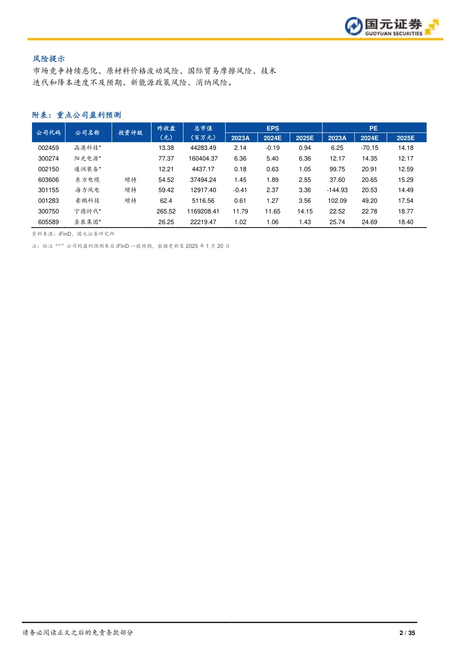 请务必阅读正文之后的免责条款部分1/35[Table_Main]行业研究|电力设备|新能源证券研究报告新能源行业策略报告2025年01月25日[Table_Title]否极泰来静待花开——电力设备与新能源行业2025年度策略[Table_Summary]报告要点:光伏:海内外需求共振,供给侧优化在即全球光伏装机规模稳步提升,当前光伏供给侧已经出现深刻变化,新建产能的能耗、水耗指标要求进一步收紧;硅料、电池是光伏供给侧优化核心抓手,看好硅料、电池率先涨价实现利润修复。辅材材料优化+出口海外或创造盈利空间。新技术看好BC渗透率提升。风电:海风装机高增在即,“海风+出海”迎景气上行2023年至2024年上半年伴随风机和产业链大部分环节价格的逐步下行,行业整体盈利能力偏弱,产业链利润在海缆等高壁垒环节集中。2024年Q3以来,风机招标价格企稳回升,管桩、铸锻件等零部件盈利能力触底回升。展望2025年,国内陆风稳步增长,海风大年来临,风电出口市场逐步打开,风电产业链各环节有望迎来业绩丰收期。新能源车:销量继续快速增长,新兴技术层出不穷2024年全年新能源汽车累计销量达1286.6万辆,同比增长35.5%,渗透率已突破40%。经过两年的激烈竞争,行业过剩产能加速出清,中游原材料价格逐步企稳,行业盈利能力边际向好。产业技术不断推陈出新,众多企业发布固态电池产品,开启商业化元年;新型硅碳技术取得质的突破,已成功应用于3C领域,未来有望大规模应用于新能源汽车,前景广阔。投资建议光伏:建议关注1)具备技术及成本优势的头部硅料、电池组件企业(协鑫科技、钧达股份、晶澳科技等);2)在BC、HJT生产设备环节与在贱金属浆料、电镀铜等方面研发、实证进度领先的企业(隆基绿能、爱旭股份、广信材料等);3)受益于光伏主产业链供给侧优化和储能需求旺盛的高景气度辅材企业(阳光电源、通润装备等)。风电:建议关注1)国内主机价格企稳回升,出口市场逐步打开,整体盈利能力持续提升,建议关注主机厂金风科技、明阳智能、运达股份;2)海缆仍是具有较高壁垒的环节,深远海趋势带动海缆电压等级、技术壁垒的提升,柔性直流起量带动海缆价值量提升。建议关注东方电缆、中天科技、亨通光电;3)海上风电装机加速,带动塔筒/管桩行业的高景气。建议关注泰胜风能、天顺风能、海力风电、大金重工;4)其他零部件环节,关注出口业务毛利高,打入海外核心主机厂的细分零部件领先企业,关注振江股份、盘古智能。锂电:2025年建议优先关注成本端受益于上游原材料价格低位,盈利稳定的电池及结构件环节,关注宁德时代、亿纬锂能、豪鹏科技及科达利、震裕科技;其次,随着供给端结构改善,行业过剩产能逐步去化,建议关注优先受益于行业复苏的领军企业如湖南裕能、龙蟠科技、万润新能、璞泰来、贝特瑞、恩捷股份、星源材质;新型硅碳负极材料兼顾高能量与快充,同时适配于固态电池体系,未来可期,建议关注产业链相关标的:硅烷科技、和远气体、元力股份、圣泉集团、天奈科技、道氏技术、硅宝科技、日播时尚。[Table_Invest]推荐|维持[Table_PicQuote]过去一年市场行情资料来源:iFinD[Table_DocReport]相关研究报告《国元证券行业研究-新能源2024年中期策略报告:大浪淘沙革故鼎新》2024.06.30[Table_Author]报告作者分析师龚斯闻执业证书编号S0020522110002电话021-51097188邮箱gongsiwen@gyzq.com.cn分析师花冠执业证书编号S0020122030005电话021-51097188邮箱huaguan@gyzq.com.cn-20%-10%0%10%20%30%40%电力设备沪深300请务必阅读正文之后的免责条款部分2/35风险提示市场竞争持续恶化、原材料价格波动风险、国际贸易摩擦风险、技术迭代和降本进度不及预期、新能源政策风险、消纳风险。附表:重点公司盈利预测[Table_Forecast]公司代码公司名称投资评级昨收盘(元)总市值(百万元)EPSPE2023A2024E2025E2023A2024E2025E002459晶澳科技*13.3844283.492.14-0.190.946.25-70.1514.18300274阳光电源*77.37160404.376.365.406.3612.1714.3512.17002150通润装备*12.214437.170.180.631.0599.7520.9112.59603606东方电缆增持54.5237494.241.451.892.5537.6020.6515.29301155海力风电增持59.4212917.40-0...