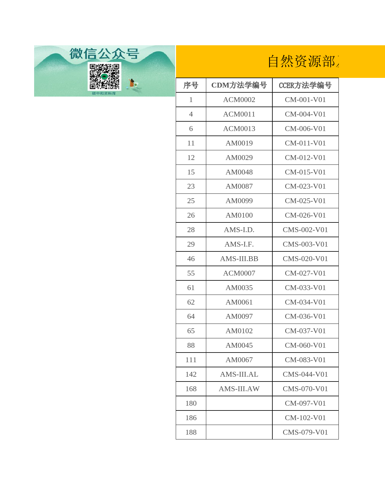 序号1ACM0002CM-001-V014ACM0011CM-004-V016ACM0013CM-006-V0111AM0019CM-011-V0112AM0029CM-012-V0115AM0048CM-015-V0123AM0087CM-023-V0125AM0099CM-025-V0126AM0100CM-026-V0128AMS-I.D.CMS-002-V0129AMS-I.F.CMS-003-V0146AMS-III.BBCMS-020-V0155ACM0007CM-027-V0161AM0035CM-033-V0162AM0061CM-034-V0164AM0097CM-036-V0165AM0102CM-037-V0188AM0045CM-060-V01111AM0067CM-083-V01142AMS-III.ALCMS-044-V01168AMS-III.AWCMS-070-V01180CM-097-V01186CM-102-V01188CMS-079-V01自然资源部及发改委CDM方法学编号CCER方法学编号189CMS-080-V0191AM0062CM-063-V01130AMS-III.AGCMS-032-V0177AM0074CM-049-V01120ACM0018CM-092-V01121ACM0020CM-093-V0116AM0049CM-016-V0134AMS-II.DCMS-008-V0145AMS-III.ZCMS-019-V0192AM0076CM-064-V01135AMS-II.H.CMS-037-V01136AMS-II.I.CMS-038-V01147AMS-III.JCMS-049-V017ACM0014CM-007-V0174AM0063CM-046-V0118AM0044CM-018-V0119AM0058CM-019-V0122AM0072CM-022-V0127AMS-I.C.CMS-001-V01101AM0036CM-073-V01159AMS-III.AJ.CMS-061-V01166AMS-III.AFCMS-068-V01169AMS-III.AXCMS-071-V019ACM0019CM-009-V0113AM0034CM-013-V0159AM0028CM-031-V0172AM0050CM-044-V0175AM0065CM-047-V0181AM0092CM-053-V0182AM0096CM-054-V0185AM0021CM-057-V0186AM0027CM-058-V0189AM0051CM-061-V01106AM0054CM-078-V0196AM0098CM-068-V01133AMS-I.B.CMS-035-V0142AMS-III.AOCMS-016-V0143AMS-III.AUCMS-017-V0147AMS-III.DCMS-021-V0149AMS-III.LCMS-023-V0152AMS-III.RCMS-026-V01154AMS-III.WCMS-056-V01138AMS-III.ABCMS-040-V01148AMS-III.KCMS-050-V01149AMS-III.NCMS-051-V01172AMS-III.Y.CMS-074-V01173AMS-III.F.CMS-075-V01174AMS-III.H.CMS-076-V01175AMS-III.I.CMS-077-V01176AMS-III.O.CMS-078-V01155AMS-III.XCMS-057-V0117AM0053CM-017-V0120AM0064CM-020-V0110AM0001CM-010-V0194AM0079CM-066-V01178AR-CM-004-V01179CM-096-V01190CMS-081-V01143AMS-III.AMCMS-045-V01158AMS-III.AH.CMS-060-V01165AMS-III.AD.CMS-067-V01170AMS-III.B.CMS-072-V01184CM-100-V01185CM-101-V01191CMS-082-V01201CM-108-V01114AM0073CM-086-V01118ACM0010CM-090-V01140AMS-III.AICMS-042-V0180AM0091CM-052-V01127AMS-II.ECMS-029-V01129AMS-II.KCMS-031-V01139AMS-III.AECMS-041-V01192CM-104-V0156ACM0016CM-028-V0160AM00...