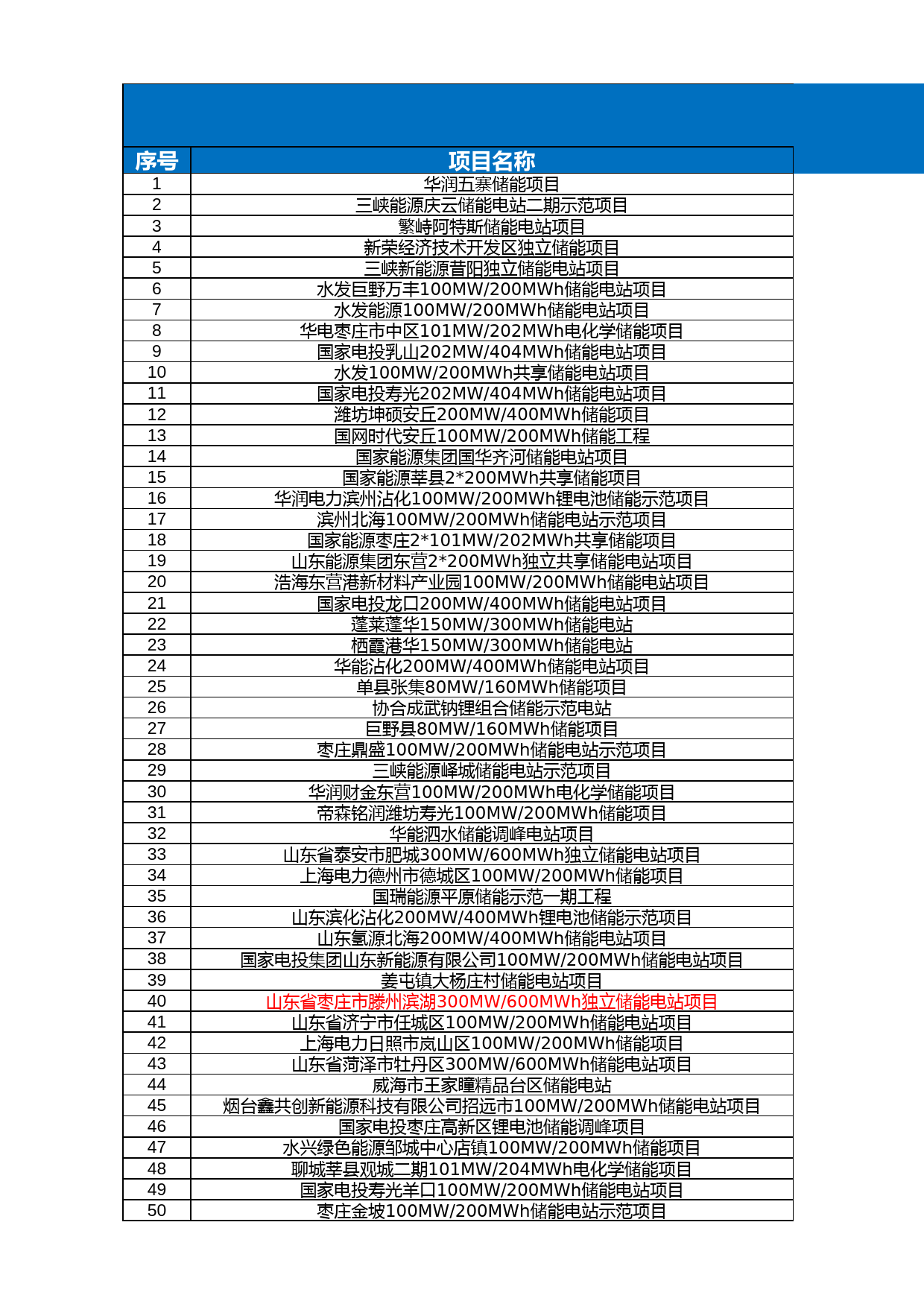序号项目名称1华润五寨储能项目2三峡能源庆云储能电站二期示范项目3繁峙阿特斯储能电站项目4新荣经济技术开发区独立储能项目5三峡新能源昔阳独立储能电站项目67891011121314国家能源集团国华齐河储能电站项目151617181920212223242526协合成武钠锂组合储能示范电站272829三峡能源峄城储能电站示范项目303132华能泗水储能调峰电站项目333435国瑞能源平原储能示范一期工程36373839姜屯镇大杨庄村储能电站项目4041424344威海市王家瞳精品台区储能电站4546国家电投枣庄高新区锂电池储能调峰项目474849502022年水发巨野万丰100MW/200MWh储能电站项目水发能源100MW/200MWh储能电站项目华电枣庄市中区101MW/202MWh电化学储能项目国家电投乳山202MW/404MWh储能电站项目水发100MW/200MWh共享储能电站项目国家电投寿光202MW/404MWh储能电站项目潍坊坤硕安丘200MW/400MWh储能项目国网时代安丘100MW/200MWh储能工程国家能源莘县2*200MWh共享储能项目华润电力滨州沾化100MW/200MWh锂电池储能示范项目滨州北海100MW/200MWh储能电站示范项目国家能源枣庄2*101MW/202MWh共享储能项目山东能源集团东营2*200MWh独立共享储能电站项目浩海东营港新材料产业园100MW/200MWh储能电站项目国家电投龙口200MW/400MWh储能电站项目蓬莱蓬华150MW/300MWh储能电站栖霞港华150MW/300MWh储能电站华能沾化200MW/400MWh储能电站项目单县张集80MW/160MWh储能项目巨野县80MW/160MWh储能项目枣庄鼎盛100MW/200MWh储能电站示范项目华润财金东营100MW/200MWh电化学储能项目帝森铭润潍坊寿光100MW/200MWh储能项目山东省泰安市肥城300MW/600MWh独立储能电站项目上海电力德州市德城区100MW/200MWh储能项目山东滨化沾化200MW/400MWh锂电池储能示范项目山东氢源北海200MW/400MWh储能电站项目国家电投集团山东新能源有限公司100MW/200MWh储能电站项目山东省枣庄市滕州滨湖300MW/600MWh独立储能电站项目山东省济宁市任城区100MW/200MWh储能电站项目上海电力日照市岚山区100MW/200MWh储能项目山东省菏泽市牡丹区300MW/600MWh储能电站项目烟台鑫共创新能源科技有限公司招远市100MW/200MWh储能电站项目水兴绿色能源邹城中心店镇100MW/200MWh储能项目聊城莘县观城二期101MW/204MWh电化学储能项目国家电投寿光羊口100MW/200MWh储能电站项目枣庄金坡100MW/200MWh储能电站示范项目515253莒县储能调峰电站项目54山东电工电气临邑储能示范项目5556珠海鹏辉能源有限公司电化学储能系统项目57国瑞能源济南商河...