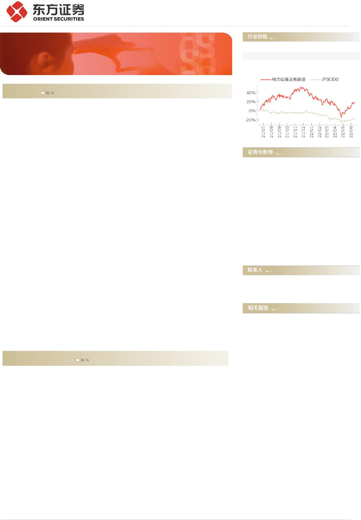 有关分析师的申明,见本报告最后部分。其他重要信息披露见分析师申明之后部分,或请与您的投资代表联系。并请阅读本证券研究报告最后一页的免责申明。 电力设备及新能源行业 行业研究 | 策略报告 ⚫ 光伏:俄乌冲突带来能源供应潜在变革,关注能源主权为光伏发展带来新机遇。2022 年俄乌局势影响欧洲能源体系,使得欧洲能源转型升级面临更大挑战。欧洲能源的对外依存度一直较高,在整体能源格局动荡过程中,加速推动新能源电力发展,成为增强能源供给的独立性有效选择之一。以德国为例,内阁于 2022 年 4 月 6日通过了一揽子法案(或称复活节法案),计划到 2030 年 80%的电力由可再生能源提供,到 2035 年几乎所有的电力均由可再生能源提供。根据该法案,到 2030 年德国太阳能发电能力将由目前的 59GW 提升至 215GW。德国的可再生能源目前主要包括风电、太阳能发电和水电,在供应中所占比例约为 42%。法案表示,俄乌冲突带来德国能源供应的转折,能源主权成为德国和欧洲安全问题。能源独立情绪蔓延,有望为光伏后续成长提供强力支撑。此外 4 月 7 日,英国也于政府官网更新了英国能源安全战略,太阳能作为新战略的一部分,当前英国的太阳能累计装机容量14GW,英国政府的目标是至 2035 年实现五倍增长。 ⚫ 全球光伏装机持续提升,分布式光伏占比提高,微型逆变器渗透率提高。根据 CPIA预测的情景,全球光伏新增装机有望从 2021 年的 170GW 增长至 2026 年的330GW。我们认为分布式光伏装机占比因 21 年组件价格处于高位,导致价格敏感性相对较低的分布式装机份额提升,在短期集中式需求弹性恢复过程中,不排除在比重上分布式占比小幅波动的情况出现,但分布式光伏自身成长属性维系,后续占比有望持续提升。我们认为其中微型逆变器在分布式市场中依靠其安全性、发电效率、可靠性以及灵活性等方面的优点叠加全球光伏组件级电力电子安全要求持续深化,微型逆变器于分布式光伏市场渗透率有望持续提升。 ⚫ 风电:下游景气招标叠加多维需求带来坚定增长,“海外+海风”两海领域展现景气。2022 年 1-3 月,国内公开招标市场新增招标量 24.7GW ,比去年同期增长了74%;按市场分类,陆上新增招标容量 19.3GW,海上新增招标容量 5.4GW,处于行业历史最高水平,国内多维度项目需求提供支撑。在 CWEA 发布 2021 年中国风电吊装容量统计简报,其中对中国风电出口情况进行了统计:出口总体情况:2021年,...