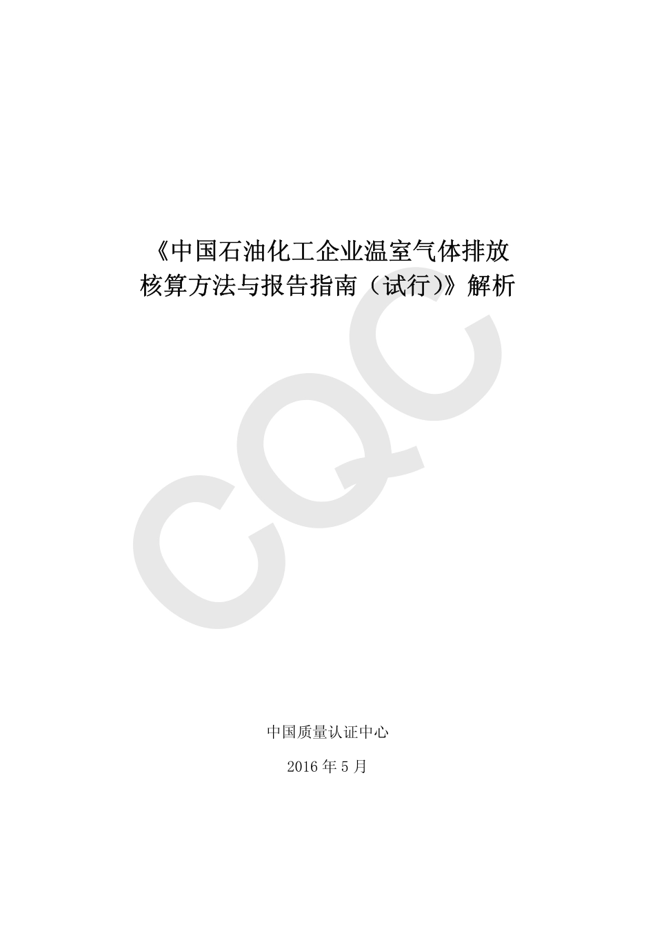 《中国石油化工企业温室气体排放 核算方法与报告指南(试行)》解析 中国质量认证中心 2016 年 5 月 CQC《中国石油化工企业温室气体排放 核算方法与报告指南(试行)》解析 编 审 委 员 会 主 编 王克娇 宋向东 程秀芹 副 主 编 于 洁 陈之莹 张丽欣 编写人员 朱齐艳 徐 芳 陈卫斌 陈远新 郑文红 审定人员 张丽欣 王 峰 张建宇 曾鉴三 王振阳 马旭辉 董方达 CQC序 言 “十三五”时期是我国全面建成小康社会的决胜阶段,也是我国实现 2020年、2030 年控制温室气体排放行动目标的关键时期,我国应对气候变化工作面临着新形势、新任务、新要求。 十八届五中全会确立了创新、协调、绿色、开放、共享的发展理念,提出加快推动低碳循环发展,主动控制碳排放,这对做好应对气候变化工作提出了更高的要求。在 2015 年 12 月联合国气候大会召开前,中国明确提出计划于 2017 年正式启动全国碳排放交易体系,第一阶段将涵盖石化、化工、建材、钢铁、有色、造纸、电力、航空等重点排放行业,届时中国的碳排放交易市场将成为全世界最大的碳排放交易市场。 根据《国民经济和社会发展第十二个五年规划纲要》提出的建立完善温室气体统计核算制度,逐步建立碳排放交易市场的目标,推动完成国务院《“十二五”控制温室气体排放工作方案》(国发[2011] 41 号)提出的加快构建国家、地方、企业三级温室气体排放核算工作体系,实行重点企业直接报送温室气体排放数据制度的工作任务,国家发展改革委先后组织制定和印发了 24 个行业的《温室气体排放核算方法与报告指南(试行)》(以下简称《指南》),并明确开展全国重点企(事)业单位温室气体排放报告工作,通过此项工作全面掌握重点单位温室气体排放情况,加快建立重点单位温室气体排放报告制度,完善国家、地方、企业三级温室气体排放基础统计和核算工作体系,加强重点单位温室气体排放管控,为实行温室气体排放总量控制、开展碳排放权交易等相关工作提供数据支撑。为保证全国重点企(事)业单位温室气体排放报告工作的顺利开展,提高各省市报送单位的报送水平和报告质量,提升地方各级政府应对气候变化主管部门综合能力,培养全国碳排放权交易专业从业人员,在国家发展改革委应对气候变化司的CQC统一指导下,中国质量认证中心针对其中 11 个行业《指南》编写了系列解析丛书,丛书包括背景介绍、指南解析、活动水平数据和排放因子获取、案例分析等主要...